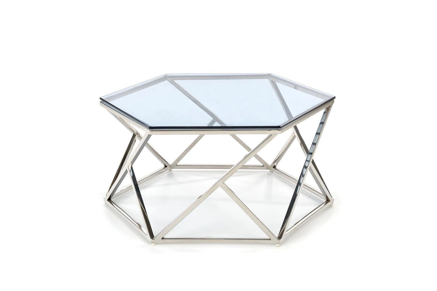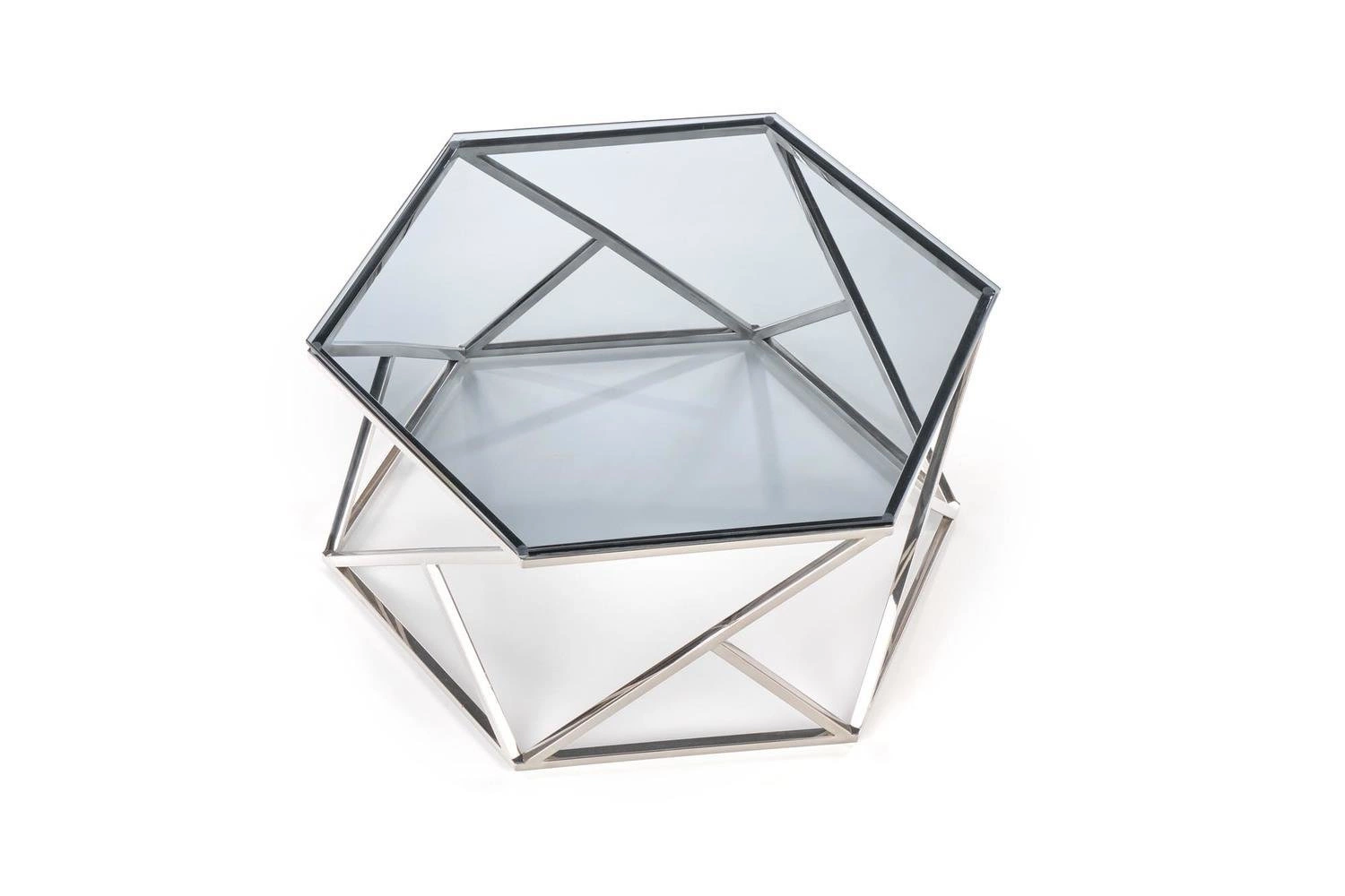 Stolik kawowy Tina to idealne rozwiązanie dla osób ceniących sobie nowoczesny styl oraz glamour. Jego heksagonalny blat wykonany z transparentnego, dymionego szkła dodaje mu wyjątkowego charakteru, a stal nierdzewna w połączeniu z chromowym stelażem gwarantują trwałość i elegancki wygląd.