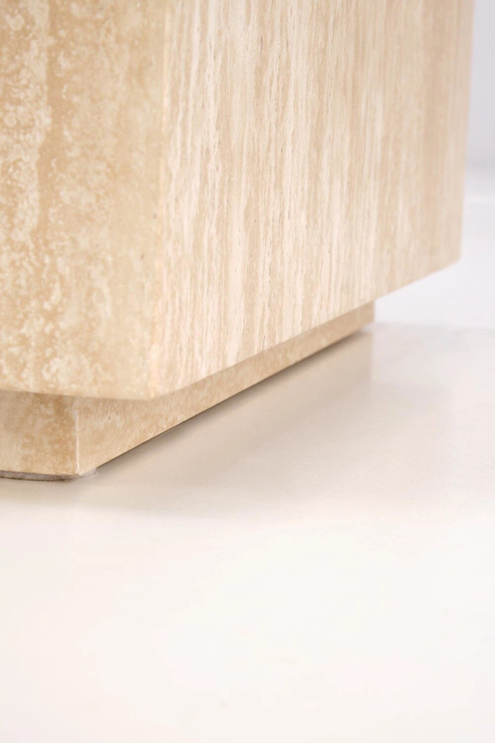 - Kwadratowa forma oraz elegancka okleina sprawiają, że stolik Travertino wpisuje się w nowoczesne trendy aranżacyjne
