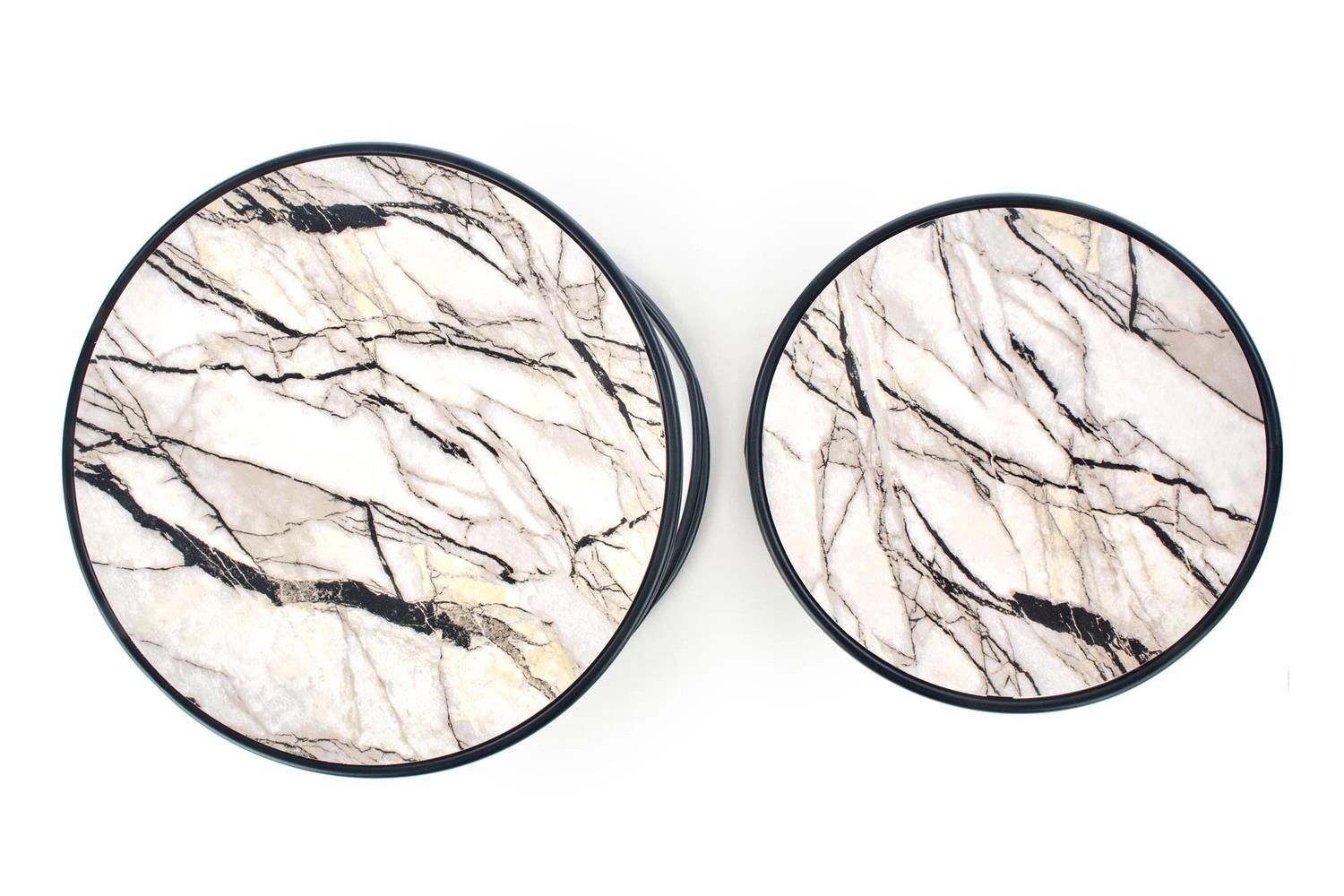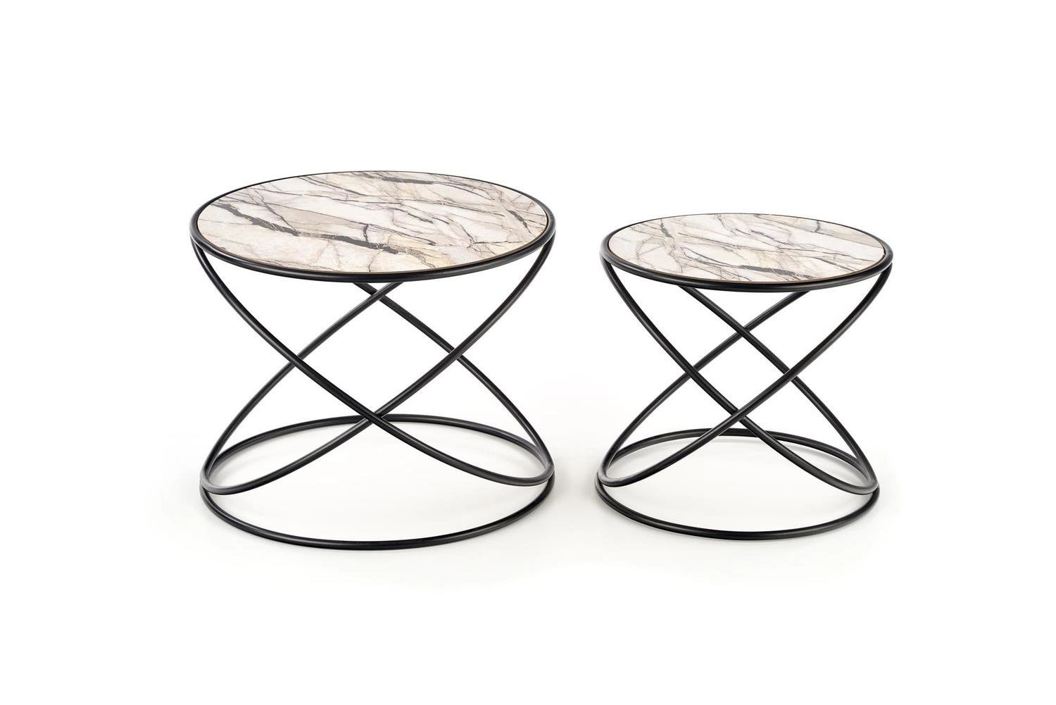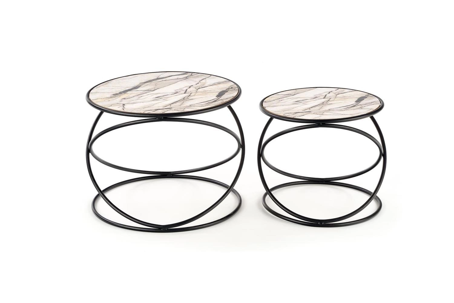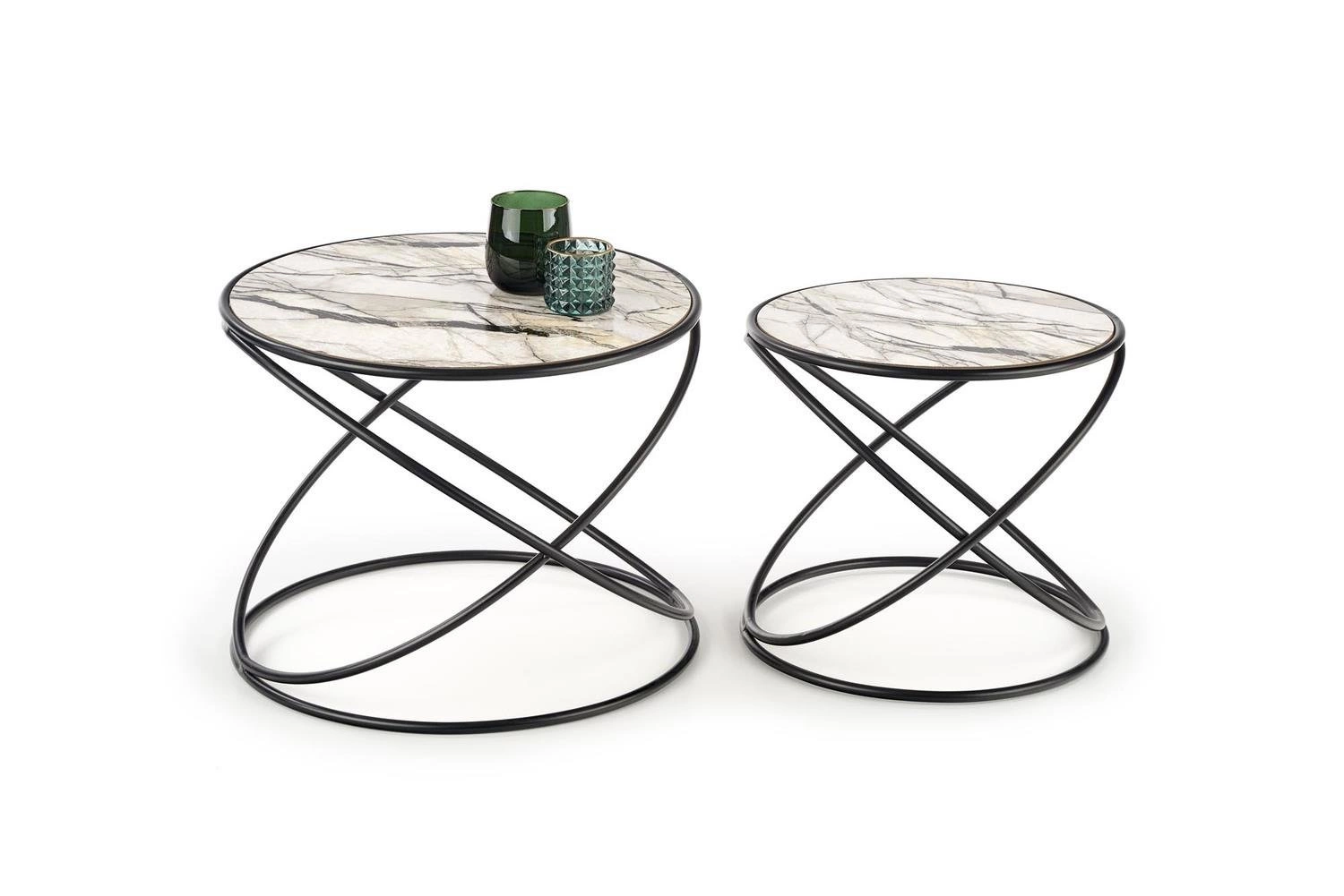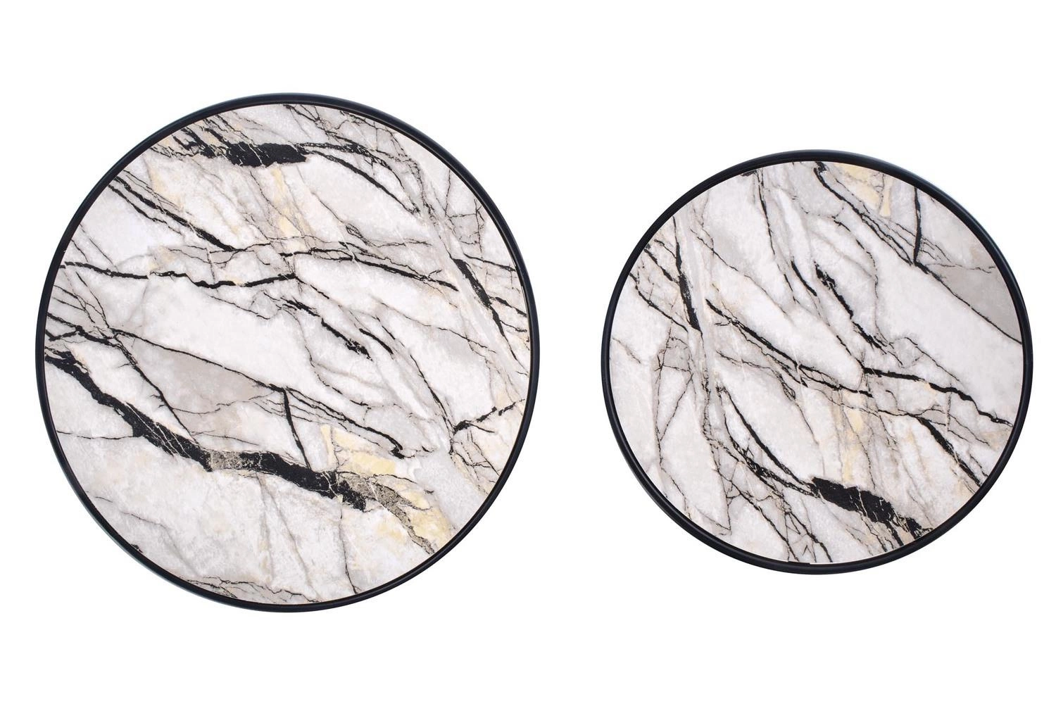 Zestaw 2 okrągłych stolików kawowych Chaletz marki Intesi to stylowe i praktyczne rozwiązanie do nowoczesnych wnętrz. Blaty o średnicy 50 cm i wysokości 39 cm wykonane z wytrzymałej płyty MDF w dekorze biały marmur prezentują się niezwykle elegancko, a czarna metalowa podstawa zapewnia stabilność oraz wyjątkowy, loftowy charakter. To nie tylko stoliki kawowe do salonu, ale również funkcjonalne ławy – idealne do codziennego odpoczynku lub spotkań z bliskimi.Poznaj bliżej zestaw Chaletz – design, który zachwyca