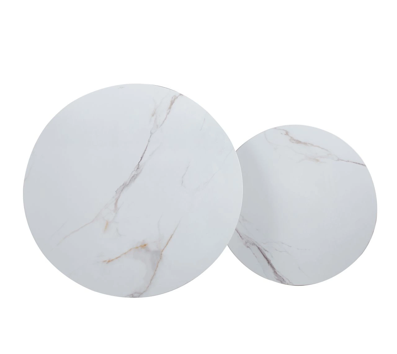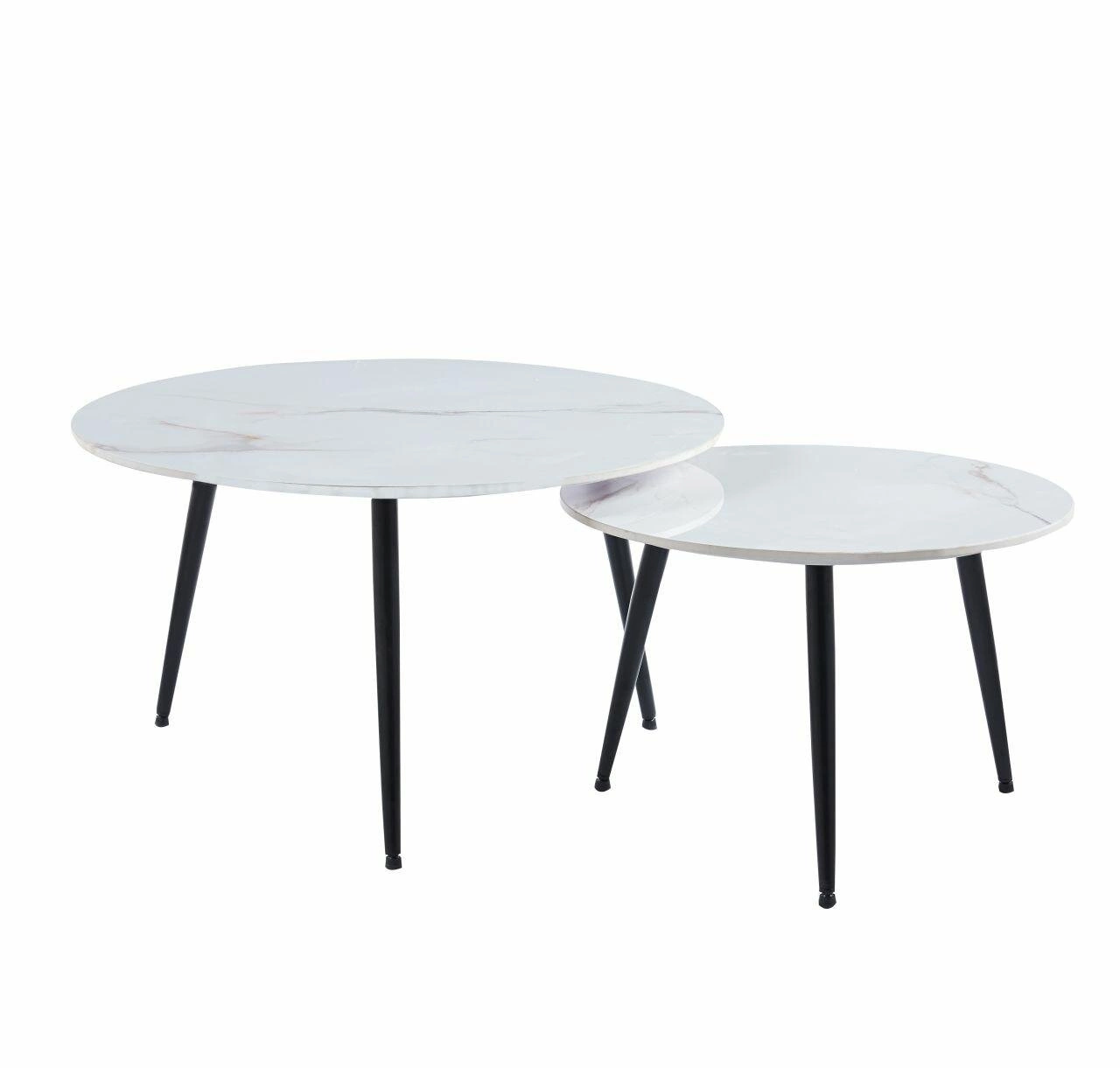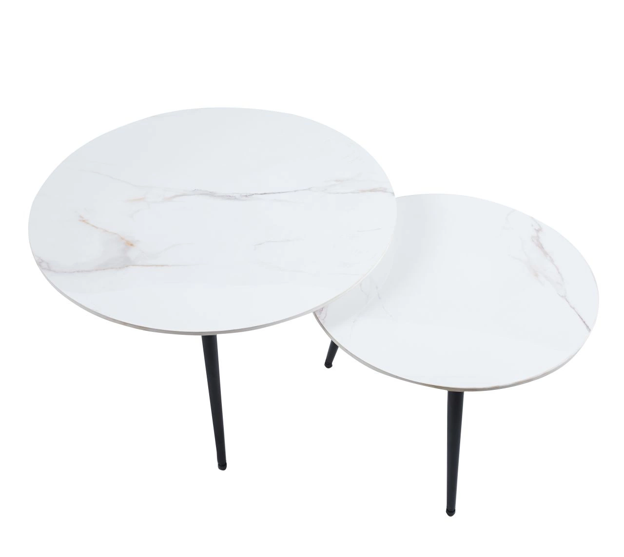 Blaty stolików wykonane są z ceramiki o pięknym, białym marmurowym wykończeniu, które dodaje im szyku i luksusowego wyglądu. Metalowe nogi w kolorze czarnym malowane proszkowo zapewniają stabilność i trwałość, co sprawia, że stoliki będą służyć przez wiele lat.