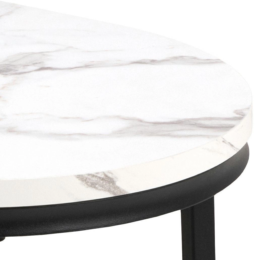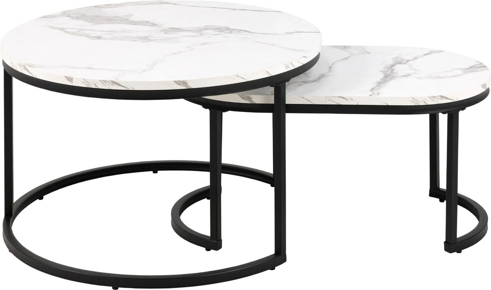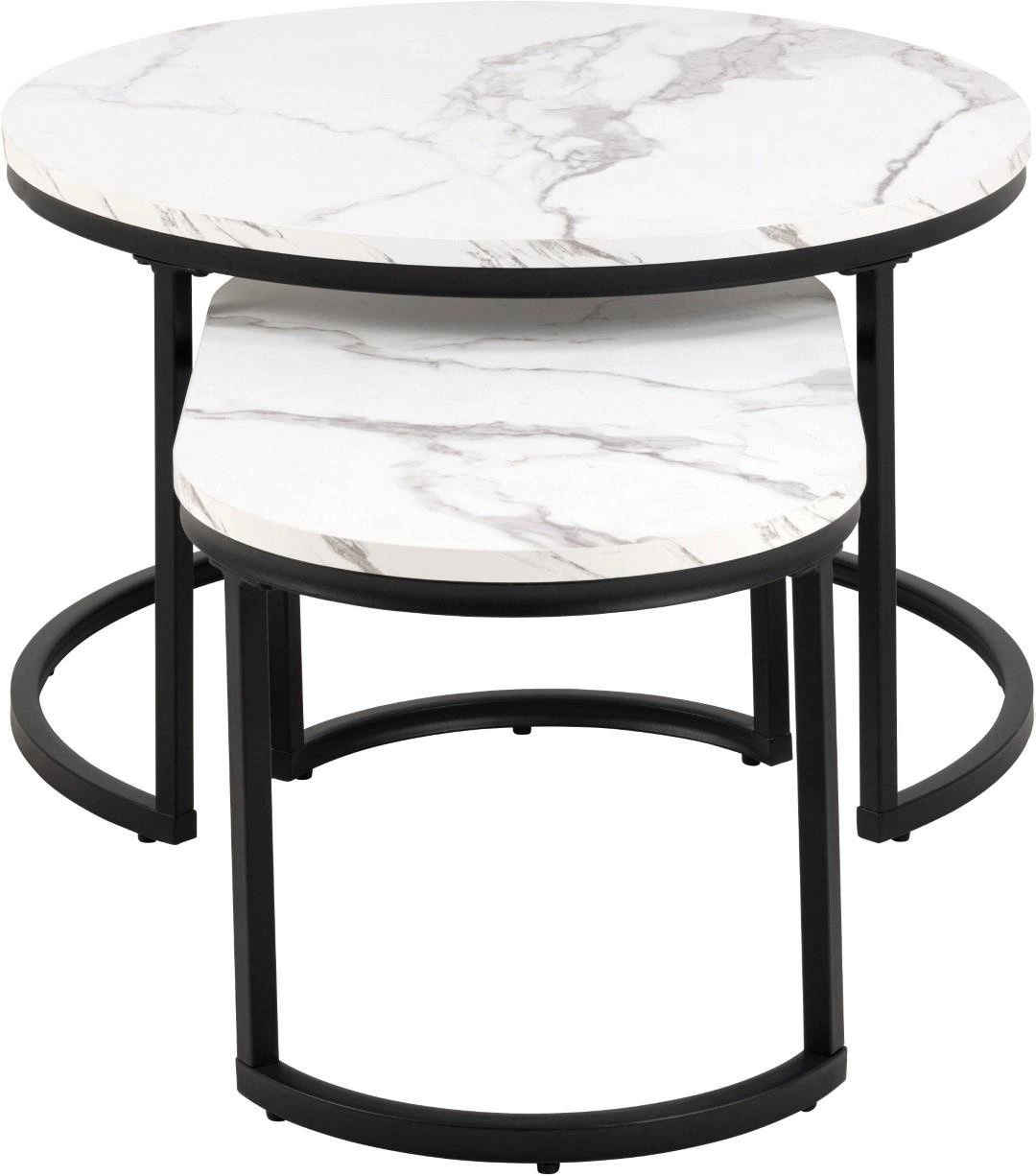 Nowoczesny zestaw dwóch stolików kawowych, którego niewątpliwą zaletą jest możliwość schowania mniejszego pod większym. Blaty stolików wykonane są z płyty MDF z okleiną imitującą marmur. Eleganckie, błyszczące blaty ciekawie współgrają z czarnymi, metalowymi podstawami stolików. Jest to idealny zestaw mebli do każdego nowoczesnego salonu lub przestrzeni biurowej, który stworzy niepowtarzalny klimat w Twojej przestrzeni życiowej.