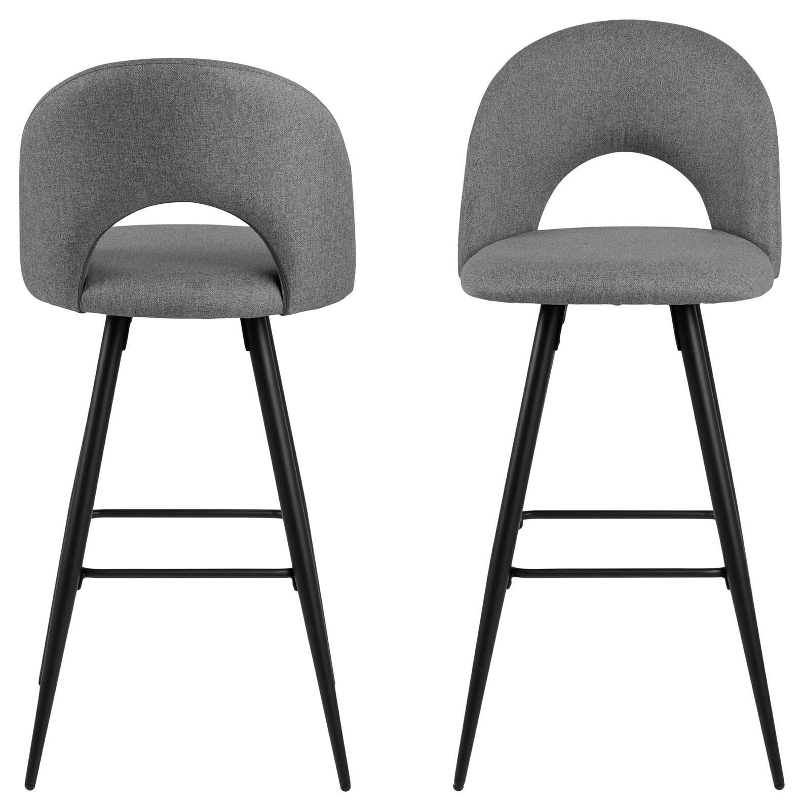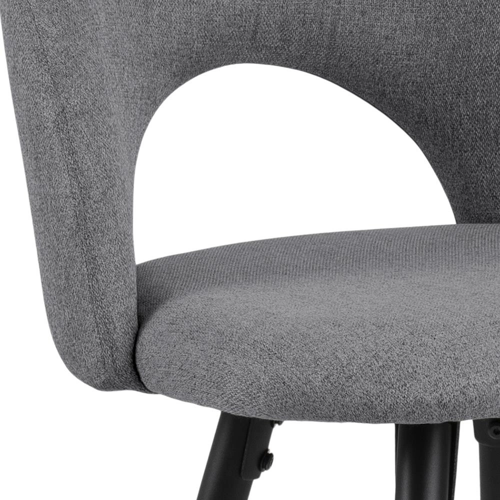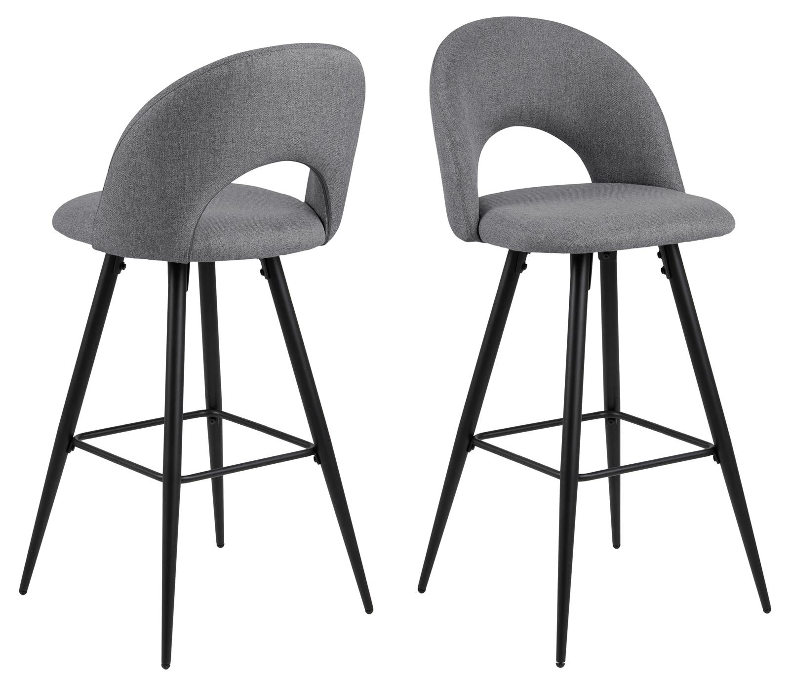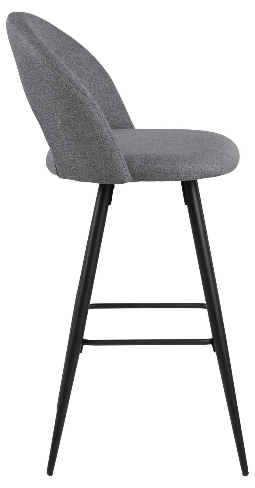 Krzesło Ayla jest tapicerowane miękką pianką i efektowną tkaniną Malmo w kolorze jasnoszarym 90 FR. Na dole podstawy krzesła znajdują się metalowe czarne nogi, które zostały pomalowane proszkowo, aby stworzyć półmatowy czarny kolor. Nogi stołka zostały ze sobą połączone poziomymi wspornikami, które pełnią rolę podstawki dla nóg.