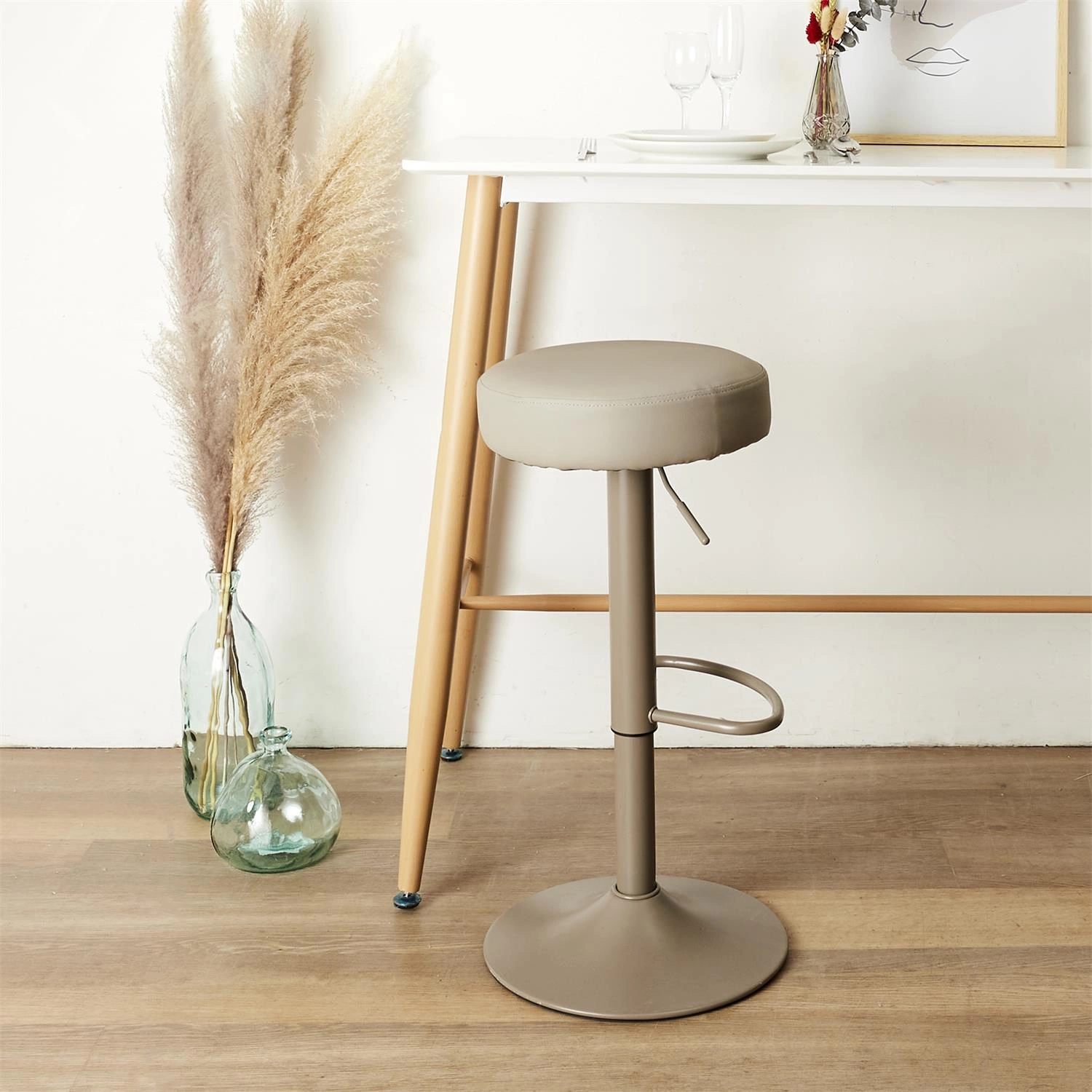 Siedzisko hokera zostało starannie wykończone tkaniną z ekoskóry, co nadaje mu elegancji i luksusowego wyglądu. Dodatkowo, tkanina jest łatwa w czyszczeniu, co oznacza, że Twój hoker zawsze będzie wyglądać jak nowy. Wysokość hokera jest regulowana w zakresie od 63,5 do 83,5 cm, dzięki czemu możesz dostosować go do swoich indywidualnych preferencji i potrzeb. To idealne rozwiązanie, jeśli chcesz używać go zarówno przy wysokim blacie kuchennym, jak i przy klasycznym stole.