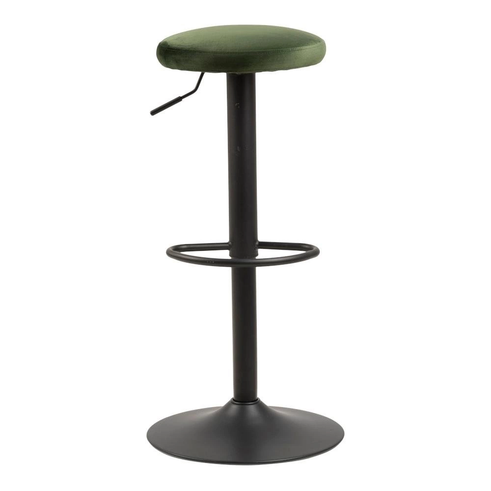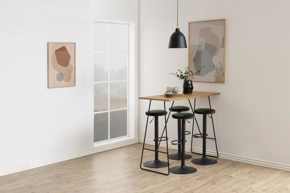 Stołek barowy Finch będzie idealnym siedziskiem przy kuchennej wyspie. Na metalowej, pomalowanej proszkowo na kolor czarny stopie, znajduje się siedzisko, które dla wygody obszyte zostało tkaniną VIC fabric forest zielony 68AC. Siedzisko wyposażono w mechanizm obrotowy oraz regulujący wysokość umożliwiający dopasowanie do postury użytkownika. Komfort z korzystania ze stołka barowego Finch dopełnia umiejscowiony na konstrukcji podstawy elegancki podnóżek. Minimalna wysokość stołka wynosi 62 cm, maksymalna 82 cm. Maksymalne obciążenie stołka wynosi 120 kg. Waga: 5,7 kg.