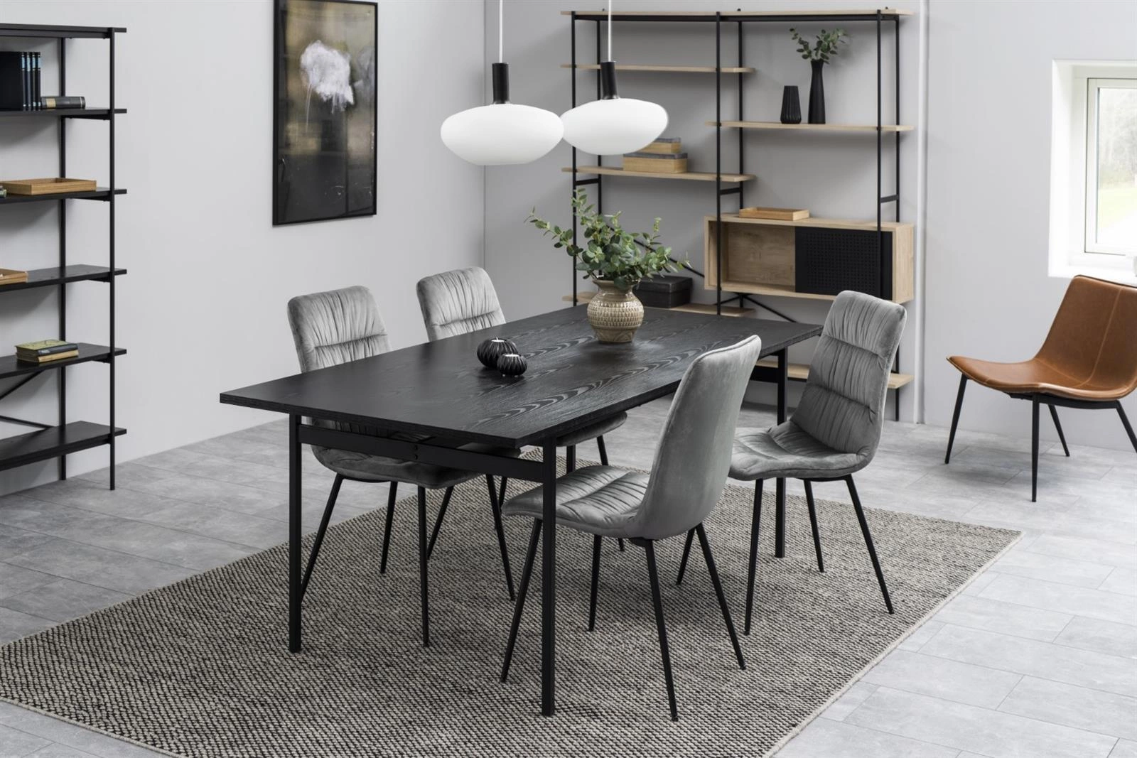 Styl industrialny wciąż jest jednym z najbardziej popularnych aranżacji w ostatnim czasie. Jego surowość, estetyka i ergonomia to cechy, które w połączeniu z niepowtarzalnym wyposażeniem tworzą wyjątkowy klimat, jaki uwielbiamy. Duch fabryki zamknięty w minimalistycznych meblach o uwydatnionej konstrukcji to obowiązkowy element takiej przestrzeni. Czarny nowoczesny STÓŁ ANGUS wraz z całą kolekcją o tej samej nazwie będą świetnym dopełnieniem industrialnego salonu. Jest to wyjątkowo elegancki mebel o subtelnym wzornictwie. Jego ergonomiczna wielkość pozwala pomieścić aż 6 krzeseł, dzięki czemu bez problemu będziesz w stanie zorganizować większe spotkanie. Blat stołu stanowi gruba płyta meblowa laminowana okleiną imitującą drewno jesionu barwione na czarno. Jest to niezwykle wytrzymały materiał, który jest odporny na zabrudzenia i zniszczenia, dzięki czemu przy odpowiedniej pielęgnacji posłuży na lata. Podstawę stanowi natomiast metalowa rama, malowana proszkowo na czarno. Całość sprawia, że mebel wygląda estetycznie, a materiały zapewniają mu nośność aż do 100 kg.