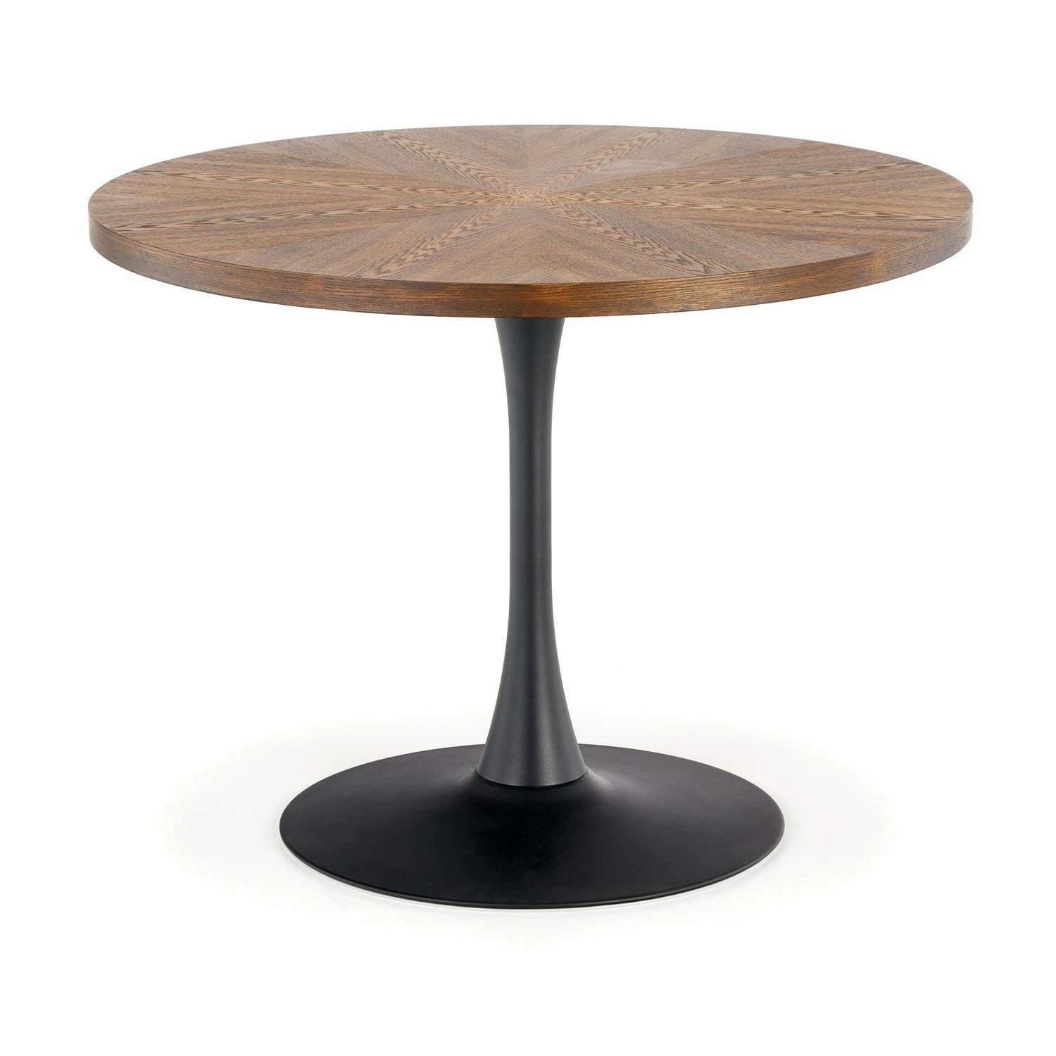 Stół Carmelia to mebel, który wyróżnia się swoim unikalnym designem i funkcjonalnością. Jego okrągły blat o wymiarach 100 cm wykonany jest z okleiny naturalnej w orzechowym kolorze, co nadaje mu elegancji i wizualnego ciepła. Noga stołu, wykonana z malowanej proszkowo stali, ma czarny kolor, co kontrastuje z jasnym blatem, tworząc interesujący efekt wizualny.