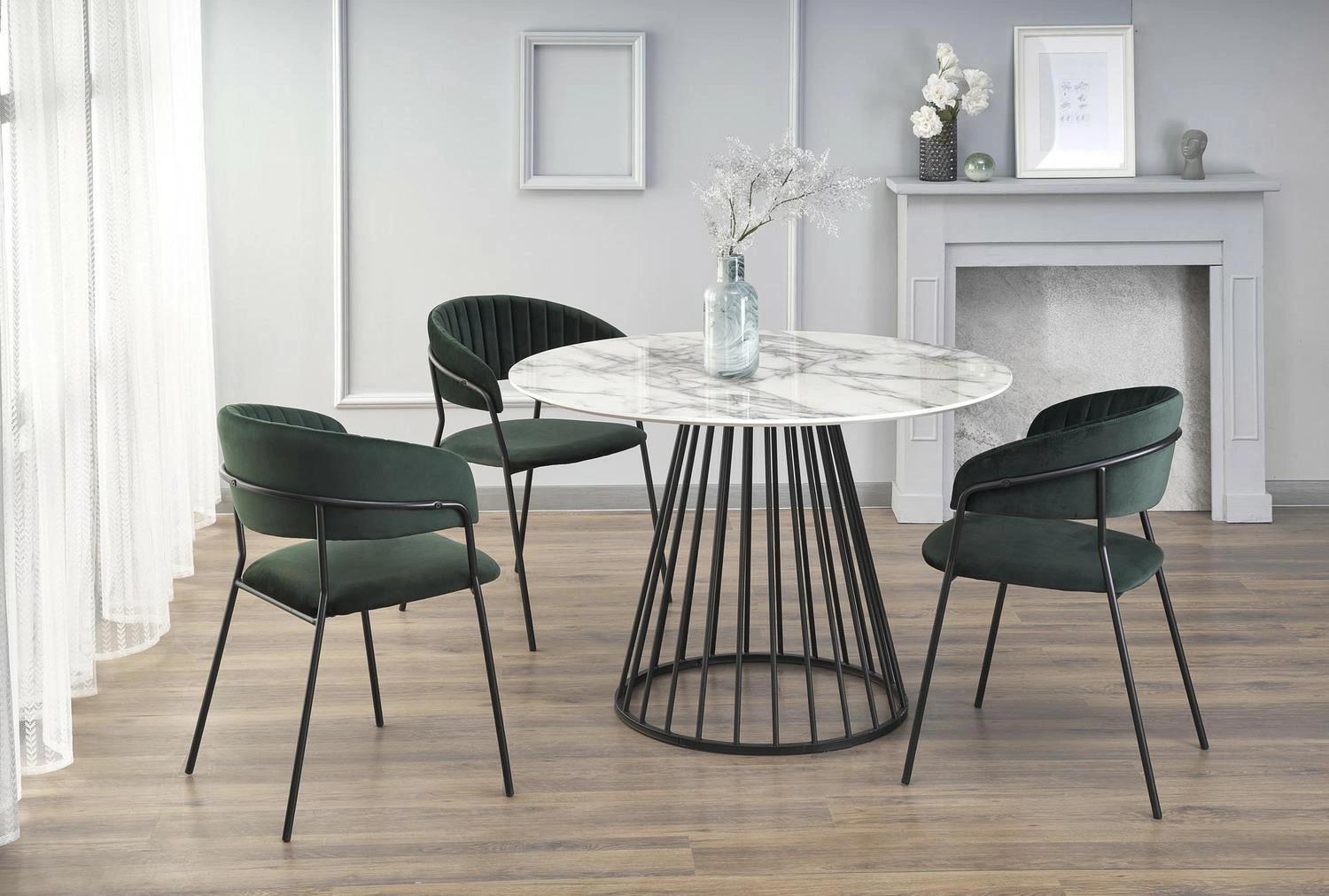 Stół Dabro to elegancki mebel o nowoczesnym stylu wykonania, który dodaje wyrafinowanego glamour do wnętrz. Jego okrągły blat o wymiarach 110 cm zapewnia wygodną przestrzeń dla czterech osób. Mebel ten doskonale wpasuje się zarówno do gustownych jadalni, jak i salonów, tworząc atmosferę luksusu i wyrafinowania. Połączenie białego marmuru na blacie z czarnymi nogami nadaje mu kontrastowy i nowoczesny wygląd, który zachwyca.