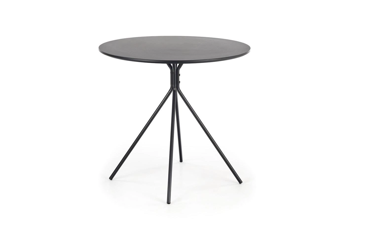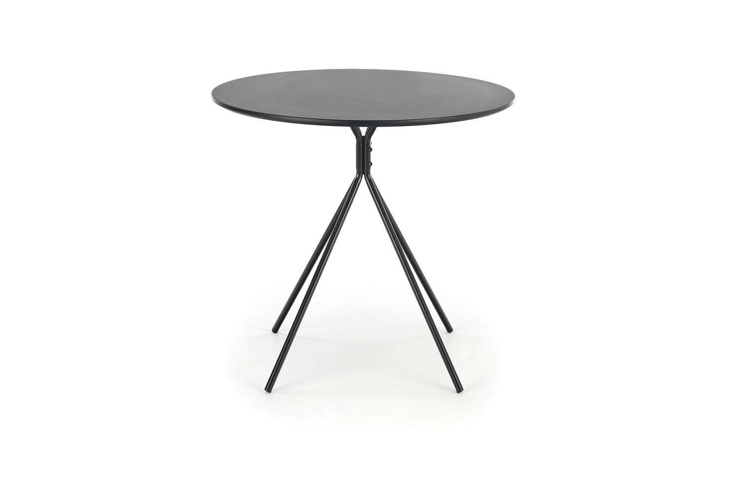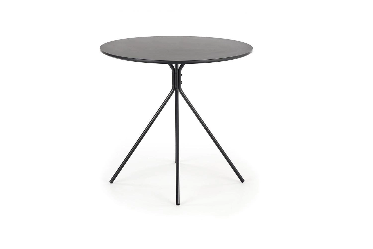 Okrągły blat zapewnia wygodne użytkowanie dla trzech osób, co czyni go doskonałym wyborem do spotkań ze znajomymi czy rodziną. Stół został wykonany z trwałych materiałów, takich jak MDF lakierowany i stal malowana proszkowo. Dzięki temu jest odporny na uszkodzenia i łatwy w utrzymaniu czystości. Czarny matowy kolor dodaje mu elegancji i stylu, pasując do różnych aranżacji wnętrz. To nie tylko praktyczny, ale również estetyczny mebel, który wyróżnia się nowoczesnym stylem wykonania.