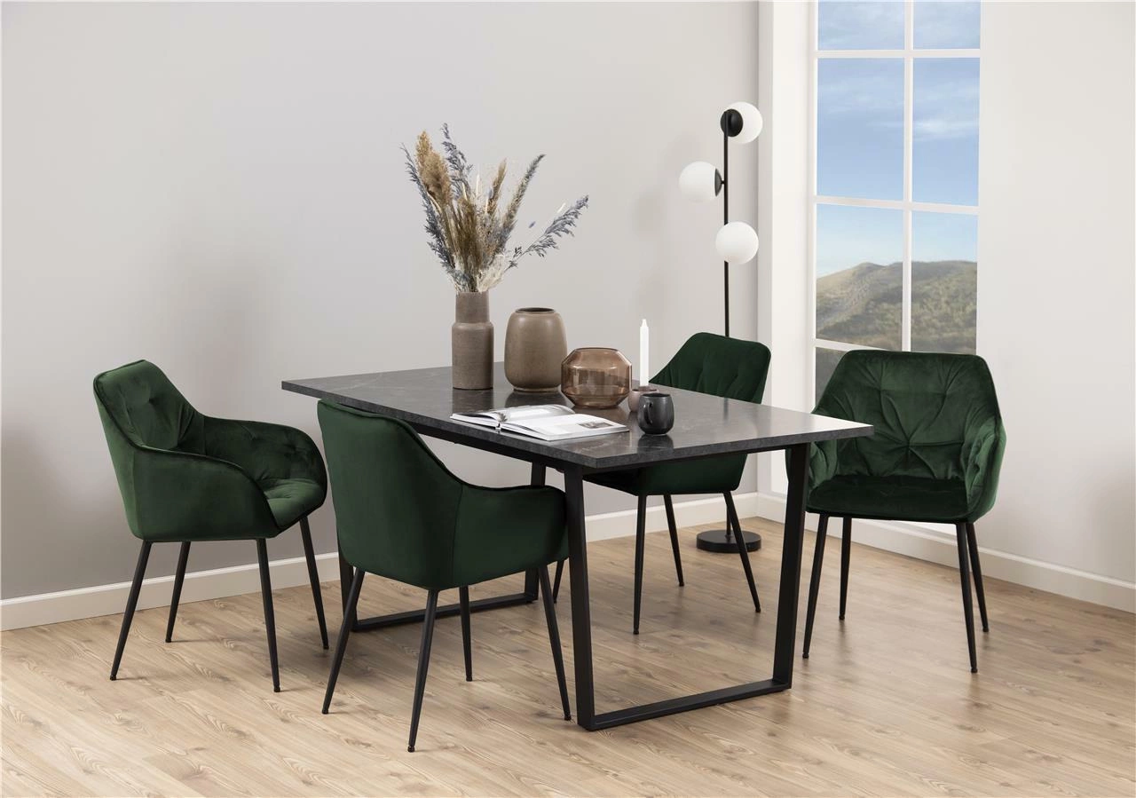 Szukasz ciekawego rozwiązania do jadalni? Nowoczesny STÓŁ AMBLE to funkcjonalny mebel, którego prosta forma będzie idealnie współgrać z krzesłami welwetowymi. Jego wyjątkowy design projektanci zbudowali poprzez blat z odpornego na zarysowania MDF, dodatkowo laminowanego okleiną imitującą czarny marmur oraz metalowej podstawy malowanej proszkowo w odcieniu eleganckiej czerni. Stół Amble posiada matowe wykończenie, co doskonale sprawdzi się we wnętrzach industrialnych i loft, a jego wymiary pozwalają na postawienie go nawet w małej jadalni czy salonie. Inwestując w stół Amble dajesz sobie szanse na praktyczny mebel w dobrym guście.