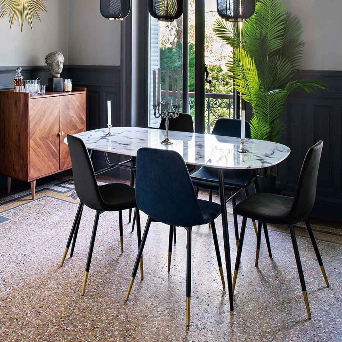 - Materiał: Stół wykonany jest z hartowanego szkła, które imituje marmur, co nadaje mu elegancki wygląd przy zachowaniu większej trwałości i odporności na zarysowania.