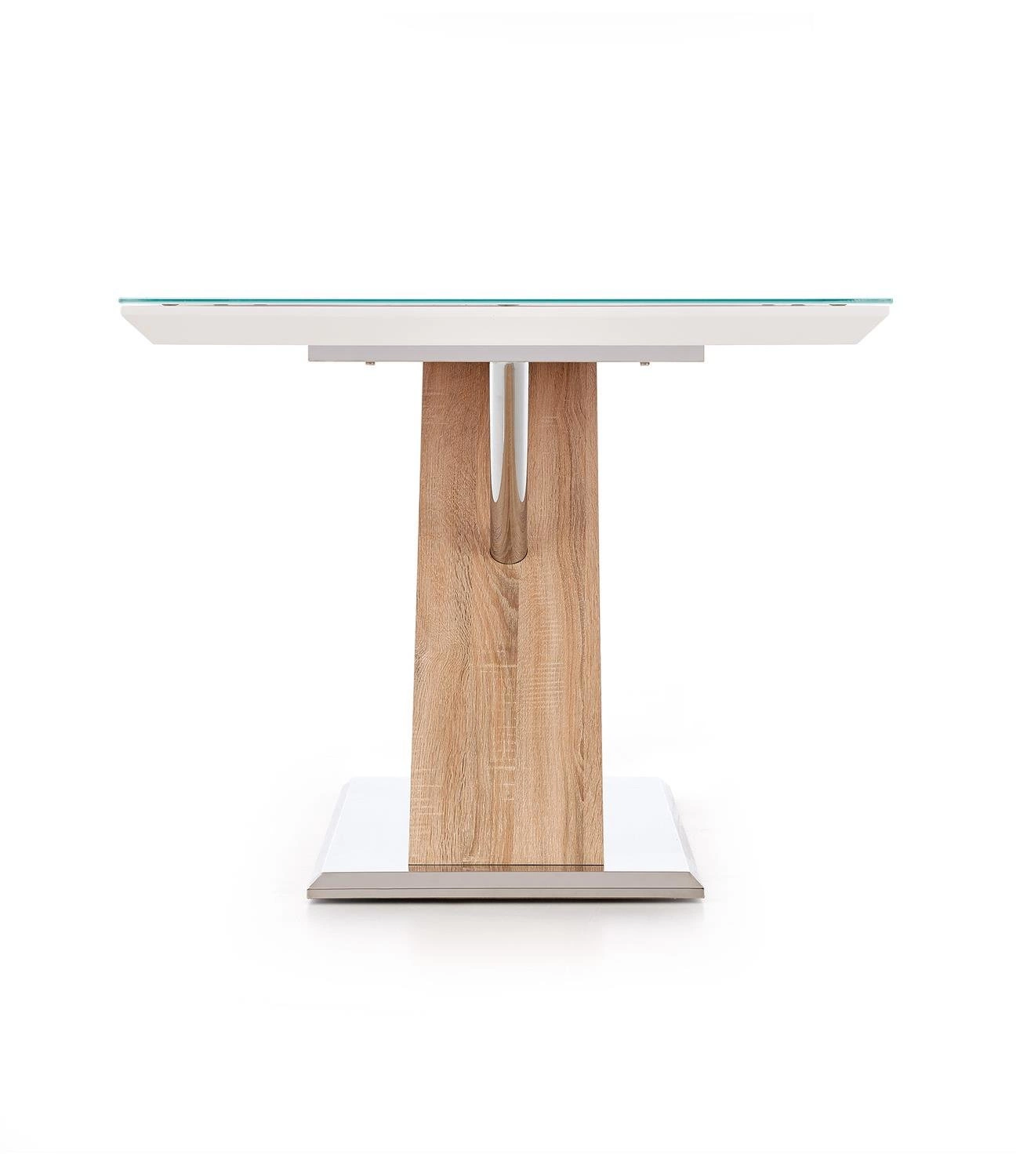 Blat w kształcie prostokąta wykonany z ekstra białego szkła nadaje mu elegancki i nowoczesny wygląd, natomiast stelaż w kolorze dąb sonoma dodaje mu ciepła i przytulności. Dzięki swojemu prostokątnemu kształtowi i odpowiednim wymiarom, stół jest bardzo funkcjonalny i łatwo można go dopasować do różnych wnętrz. Ponadto, jego materiały są łatwe w utrzymaniu czystości, co ułatwia codzienne użytkowanie. Stół nie posiada rozkładanego blatu, ale jego solidna konstrukcja z jedną nogami zapewnia stabilność i wygodę podczas spożywania posiłków.