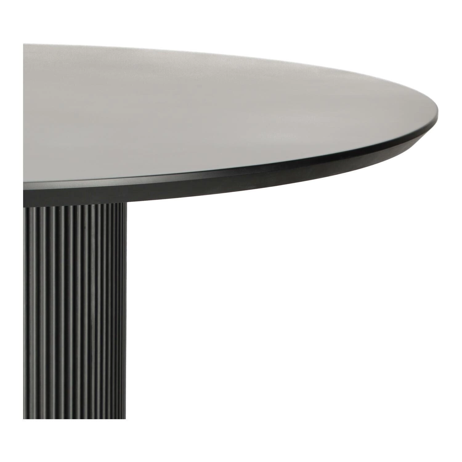 Stół został wykonany z wytrzymałego połączenia melaminy i płyty MDF, co gwarantuje jego trwałość i odporność na uszkodzenia. Blat stołu pokryty jest melaminą, która nie tylko jest trudnopalna, ale również wyjątkowo odporna na działanie wody, wysokich temperatur oraz promieniowanie świetlne. Podstawa stołu, ozdobiona lamelami, wykonana została z frezowanej płyty MDF, co dodaje mu niepowtarzalnego charakteru. Stylowy design stołu, w połączeniu z klasycznym wykończeniem w kolorze czarnym, sprawia, że mebel ten doskonale wpisuje się w różnorodne aranżacje wnętrz. Idealnie sprawdzi się zarówno w salonie, jako miejsce spotkań z rodziną i przyjaciółmi, jak i w przestrzeni jadalnianej, tworząc elegancką atmosferę.