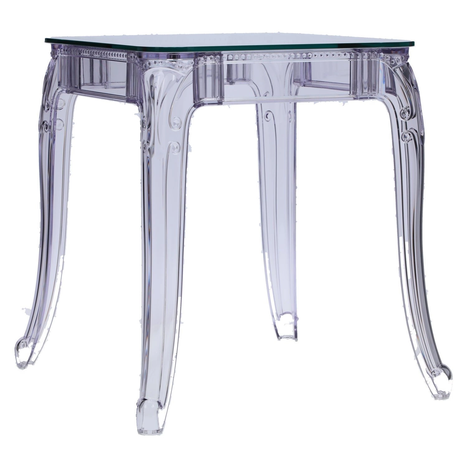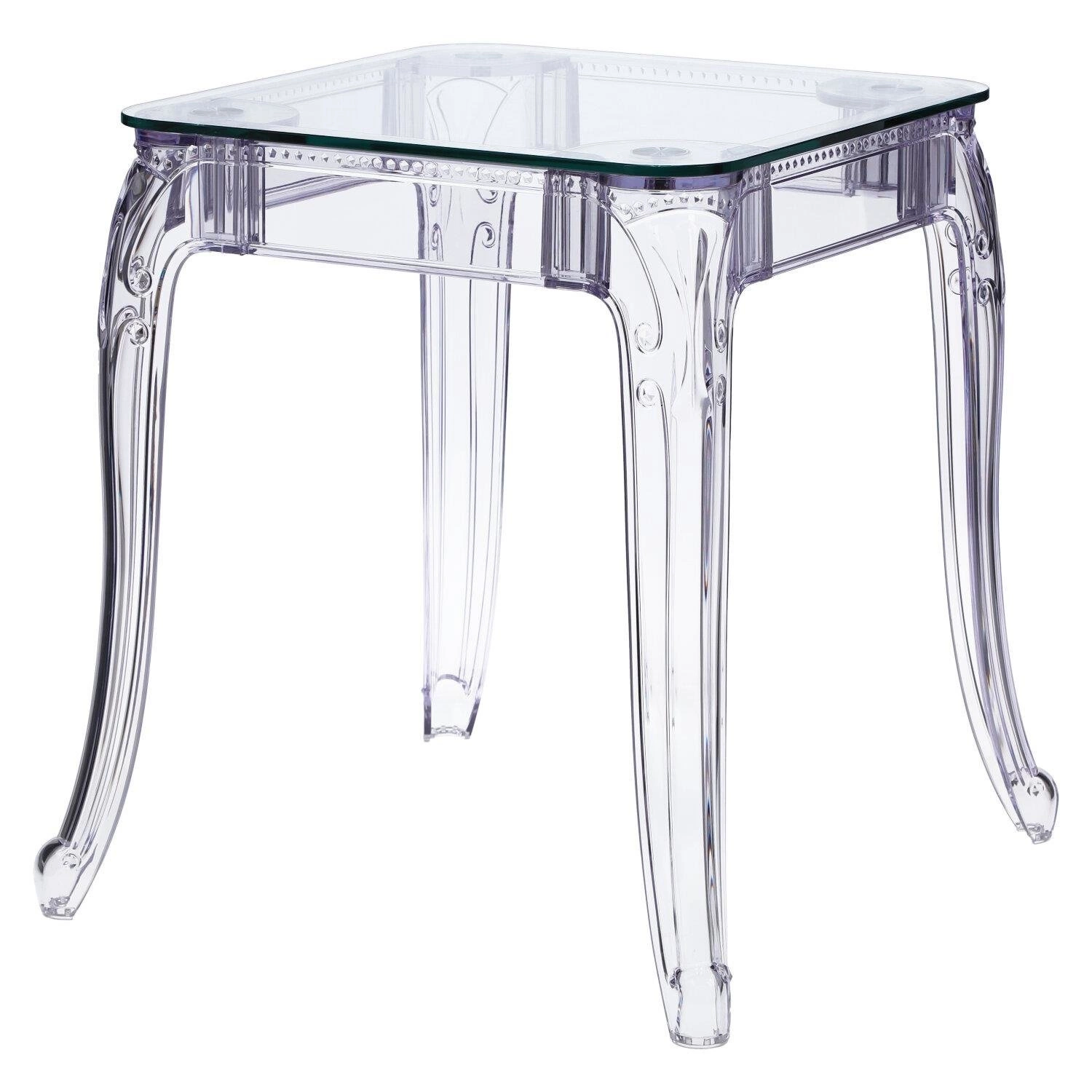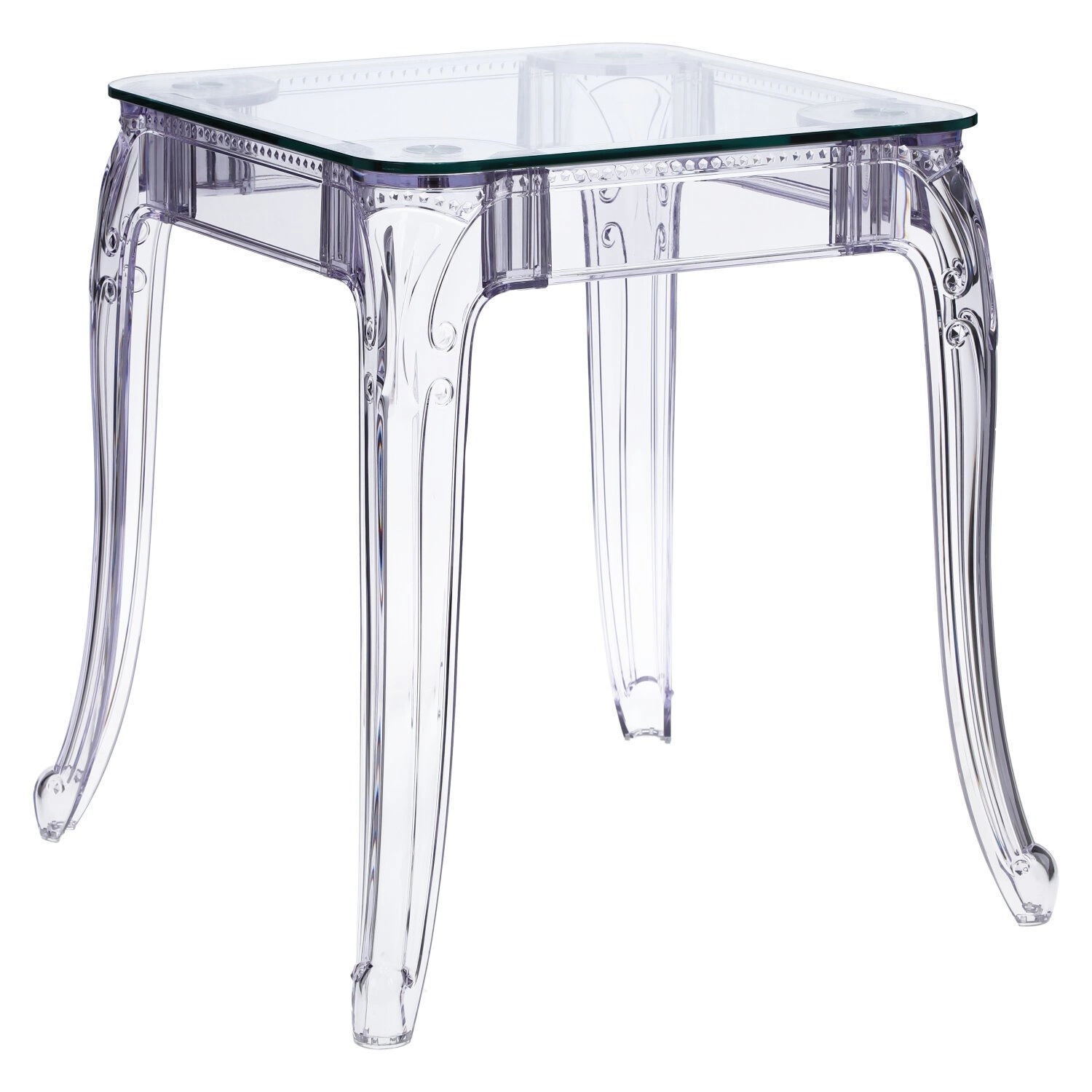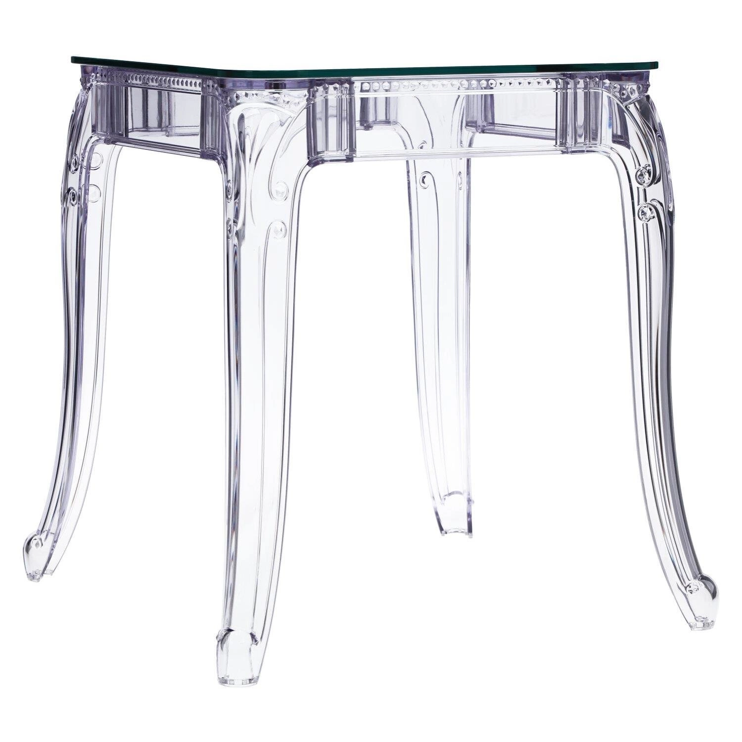 Stół Ghost to połączenie klasycznej wręcz barokowej formy oraz nowoczesnej techniki i wytrzymałych materiałów. Stół Ghost posiada szklany blat o grubości 10 mm, który podpierają bogato zdobione poliwęglanowe nogi. Poliwęglan to bardzo wytrzymałe tworzywo o szerokim zastosowaniu. Dzięki temu, że nogi stołu zostały zrobione ze sztucznego tworzywa, są one odporne na wilgoć. Szklany blat stołu dodaje mu lekkości, a wykorzystanie szkła sprawia, iż blat odporny jest na ciepło. Na stole możemy śmiało stawiać gorące naczynia bez obawy, iż blat się odparzy. Ghost to doskonały stół do małej jadalni, kuchni lub salonu. Przezroczysta forma mebla sprawia, iż nie przytłacza on pomieszczenia, a wręcz odbija światło i wnętrze wydaje się większe. Stół dostępny jest w dwóch rozmiarach. Grubość blatu: 10 mm Grubość nóg: od 5 do 8,5 cm