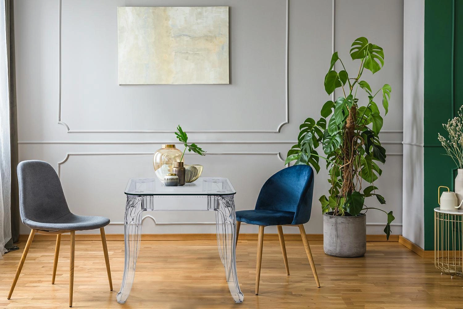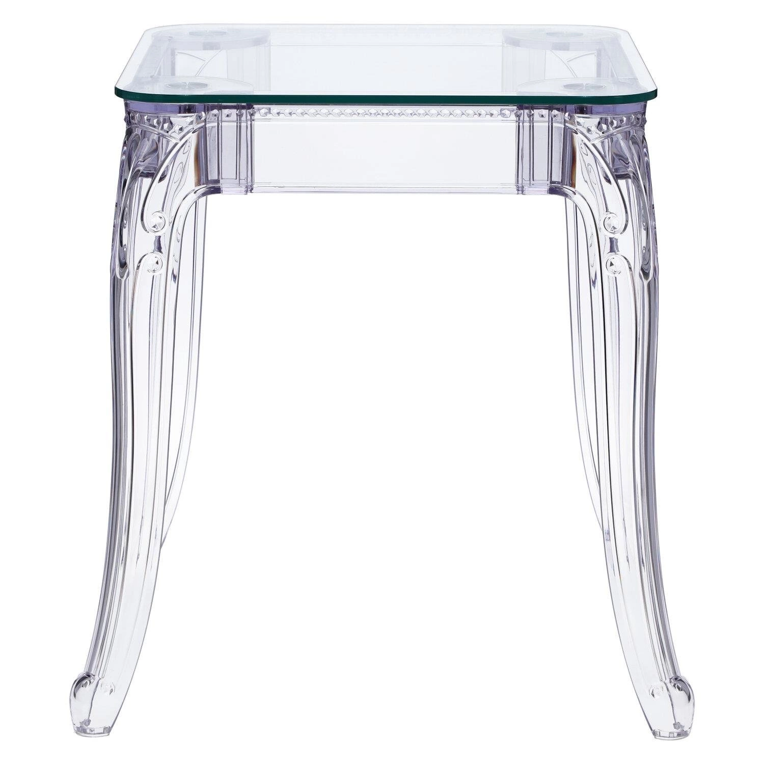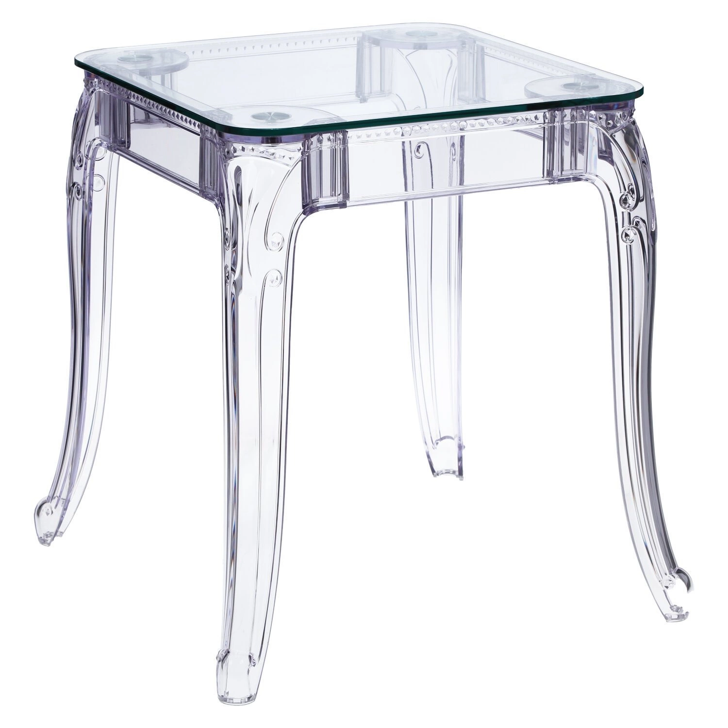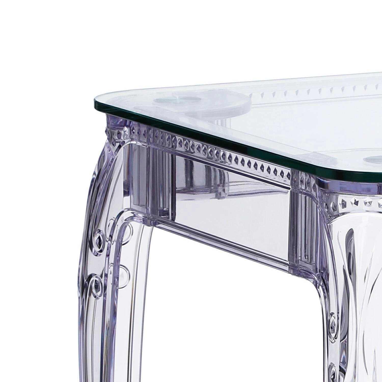 Stół Ghost to połączenie klasycznej wręcz barokowej formy oraz nowoczesnej techniki i wytrzymałych materiałów. Stół Ghost posiada szklany blat o grubości 10 mm, który podpierają bogato zdobione poliwęglanowe nogi. Poliwęglan to bardzo wytrzymałe tworzywo o szerokim zastosowaniu. Dzięki temu, że nogi stołu zostały zrobione ze sztucznego tworzywa, są one odporne na wilgoć. Szklany blat stołu dodaje mu lekkości, a wykorzystanie szkła sprawia, iż blat odporny jest na ciepło. Na stole możemy śmiało stawiać gorące naczynia bez obawy, iż blat się odparzy. Ghost to doskonały stół do małej jadalni, kuchni lub salonu. Przezroczysta forma mebla sprawia, iż nie przytłacza on pomieszczenia, a wręcz odbija światło i wnętrze wydaje się większe. Stół dostępny jest w dwóch rozmiarach. Grubość blatu: 10 mm Grubość nóg: od 5 do 8,5 cm