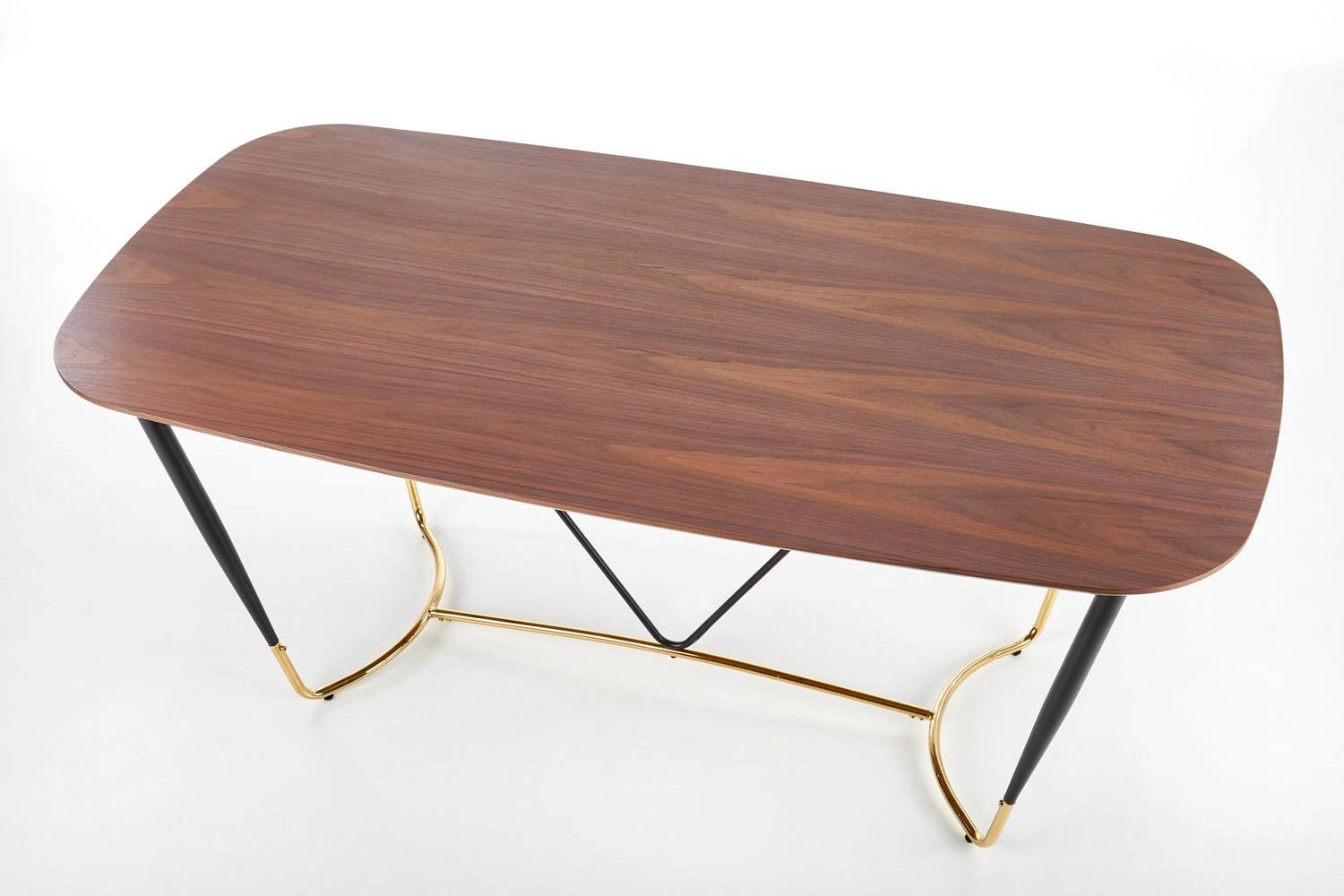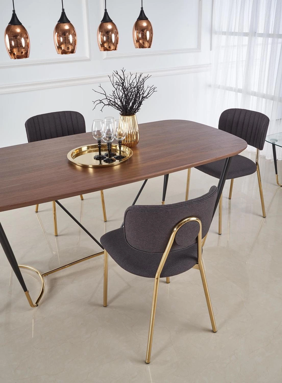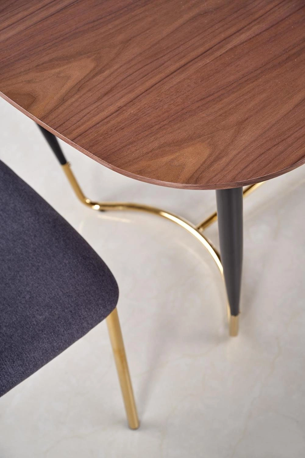 Stół wykonany jest z wysokiej jakości materiałów, takich jak MDF i okleina naturalna, co gwarantuje trwałość i elegancki wygląd. Blat w kolorze orzechowym jest nie tylko piękny, ale i łatwy w utrzymaniu w czystości. Nogi stołu są wykonane z malowanej proszkowo lub chromowanej stali, co nadaje mu nowoczesnego wyglądu. Styl wykonania to połączenie nowoczesności z glamour, dzięki czemu stół z łatwością wpasuje się w każde wnętrze.