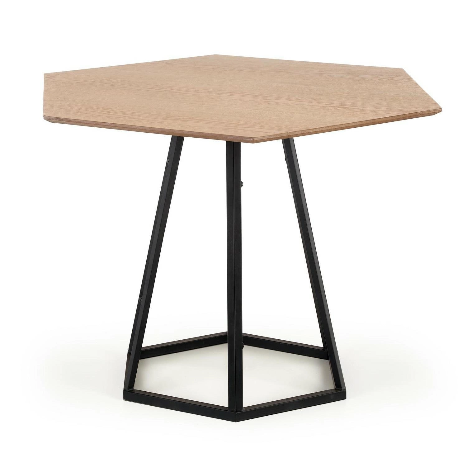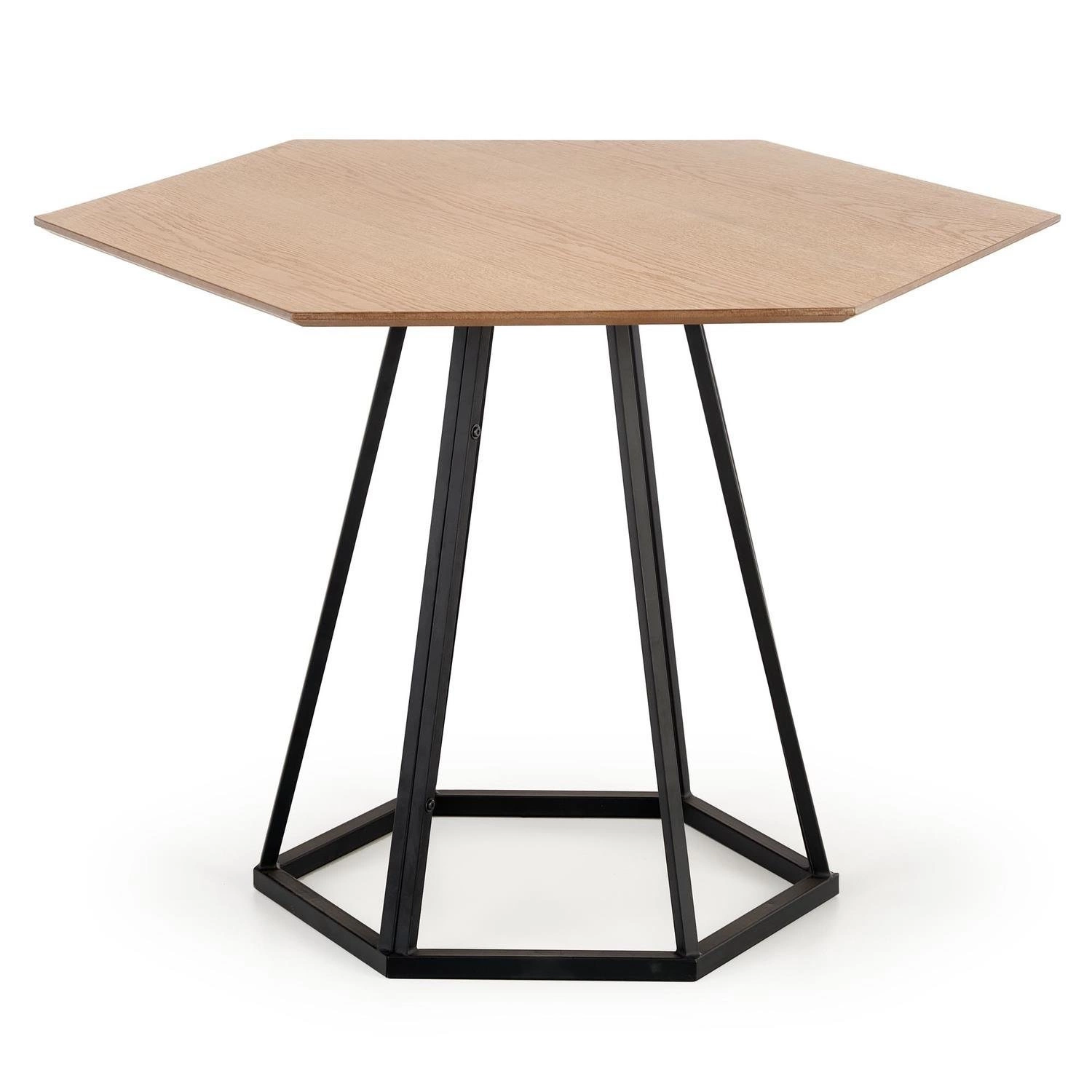 Stół Hexis to mebel o wyjątkowym designie i funkcjonalności. Jego sześcioboczny blat o wymiarach 110 cm wykonany z MDF z okleiną w kolorze naturalnym nadaje mu naturalnego uroku i elegancji. Noga stołu, wykonana z malowanej proszkowo stali, ma kolor czarny, co tworzy kontrastujące połączenie kolorów.