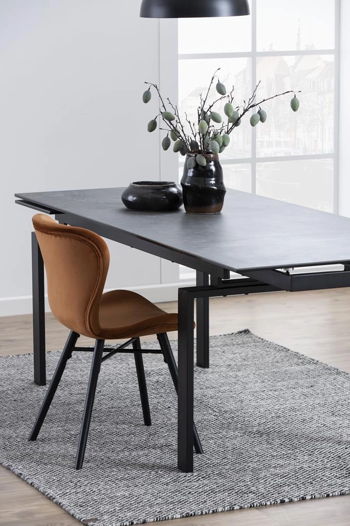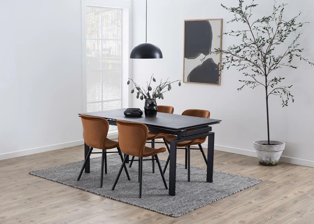 Stół Huddersfield w kolorze czarnym to masywny mebel o ciekawej, nowoczesnej formie. Podstawę stanowi geometryczna metalowa konstrukcja z czterema prostokątnymi nogami. Długi blat wykonany jest z płyty ceramicznej o chropowatej powierzchni. Ten wyjątkowy model, idealnie pasujący do wnętrz w stylu industrialnym, sprawdzi się zarówno w salonie, jadalni, jak i w przestrzeniach komercyjnych np restauracji lub kawiarni. Stół jest również bardzo funkcjonalny z dużą ilością miejsca na posiłki i spotkania towarzyskie. Pod blatem znajduje się przestronna półka, idealna do przechowywania czasopism i książek. Czarny stół Huddersfield to przyciągający uwagę element, który z pewnością wniesie styl i funkcjonalność do każdego wnętrza.