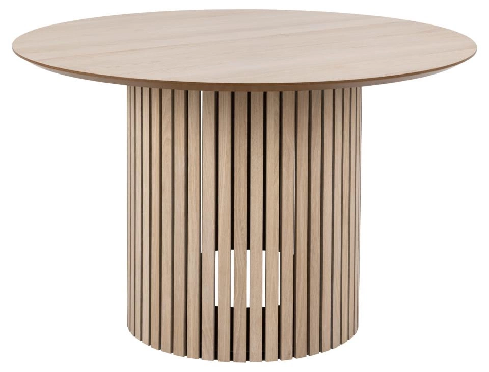 - Podstawa stołu z lakierowanego dębu posiada jednonożną konstrukcję ozdobioną lamelami, dodającą elegancji.