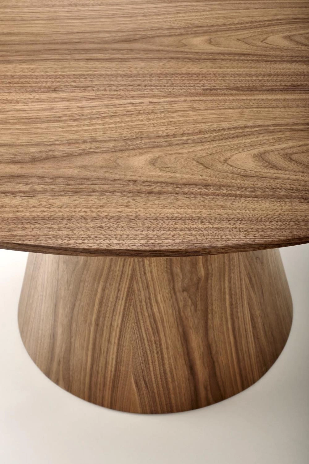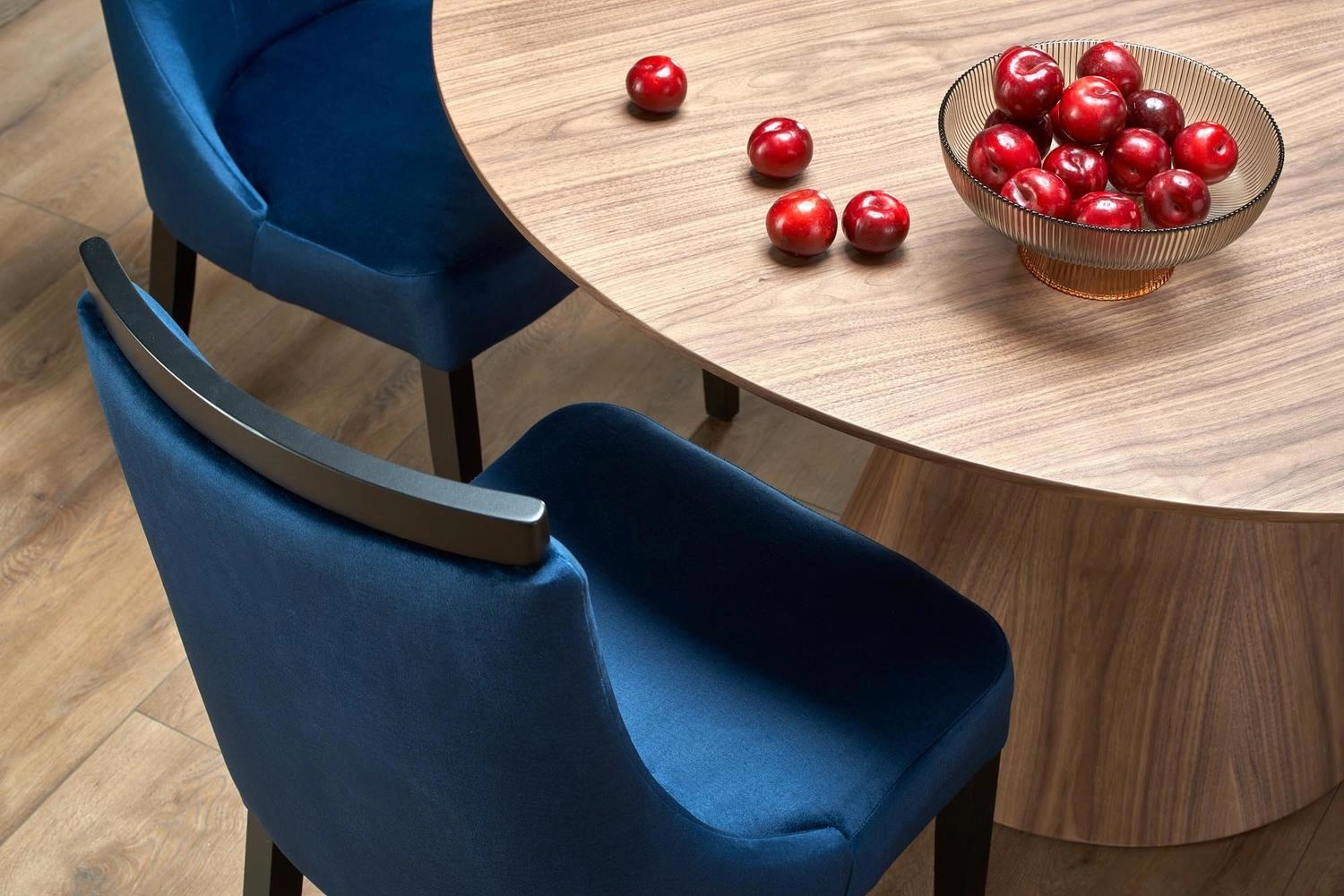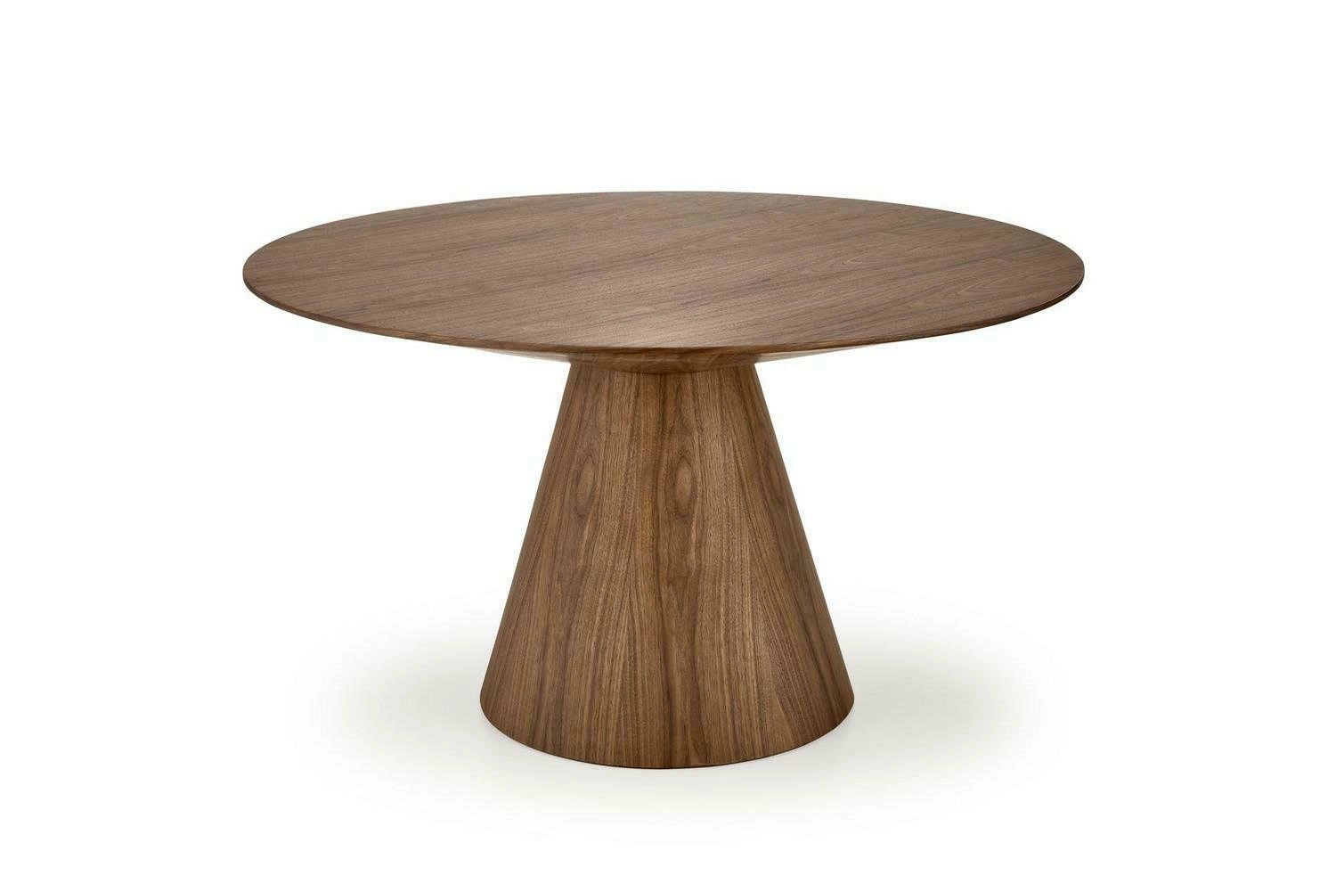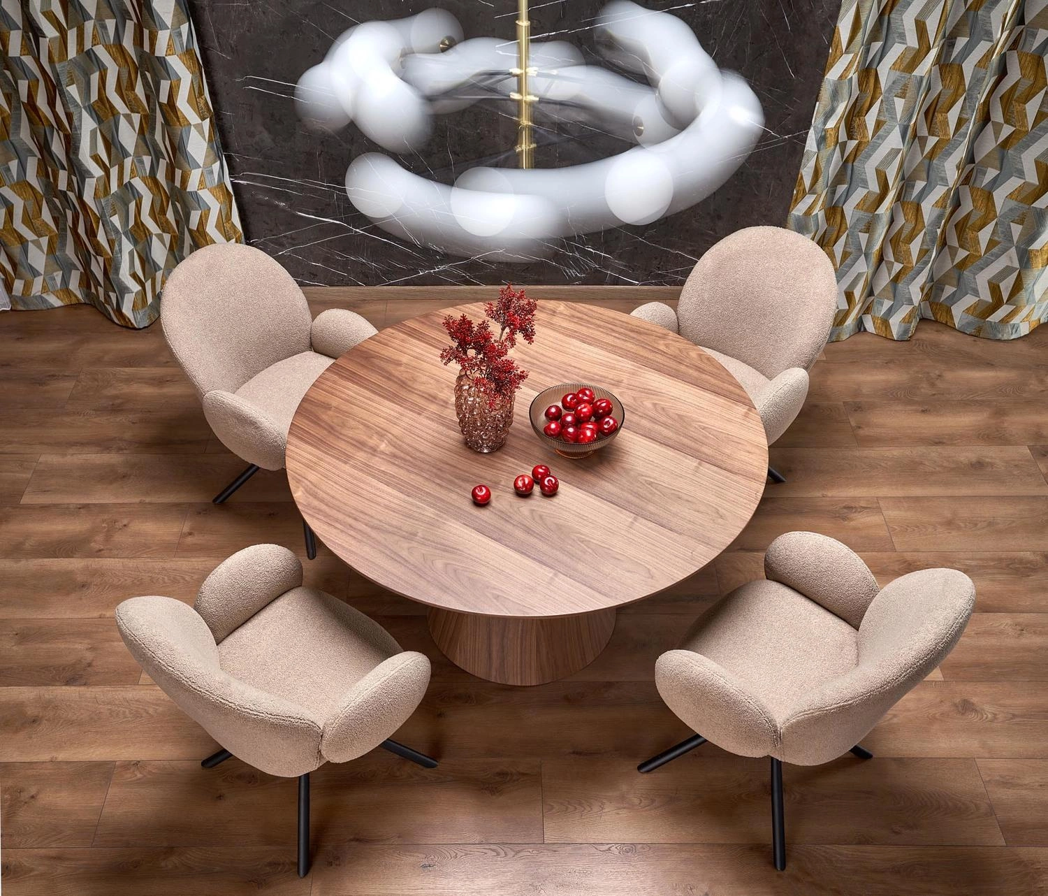 Stół Obituar to nowoczesny mebel o wyjątkowym designie i funkcjonalności. Jego okrągły, orzechowy blat wykonany z naturalnej okleiny nadaje mu elegancji i ciepłego wyglądu. Jego wymiary wynoszą 136 cm średnicy i 78 cm wysokości, co sprawia, że jest idealnym rozwiązaniem zarówno dla 5-osobowej, jak i 4-osobowej rodziny.