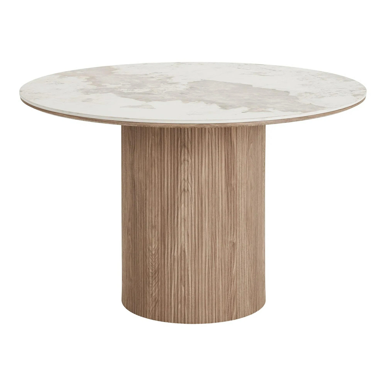 Stół Athens dobrze odnajdzie się zarówno w jasnej kuchni skandynawskiej, nowoczesnej jadalni, jak i w salonie połączonym z aneksem. Neutralne połączenie bieli i brązu łatwo dopasować do krzeseł w różnych kolorach – od bieli, przez szarości, aż po czerń. To uniwersalny stół okrągły do salonu i jadalni, który możesz z czasem aranżować na nowo, bez konieczności wymiany mebla.
