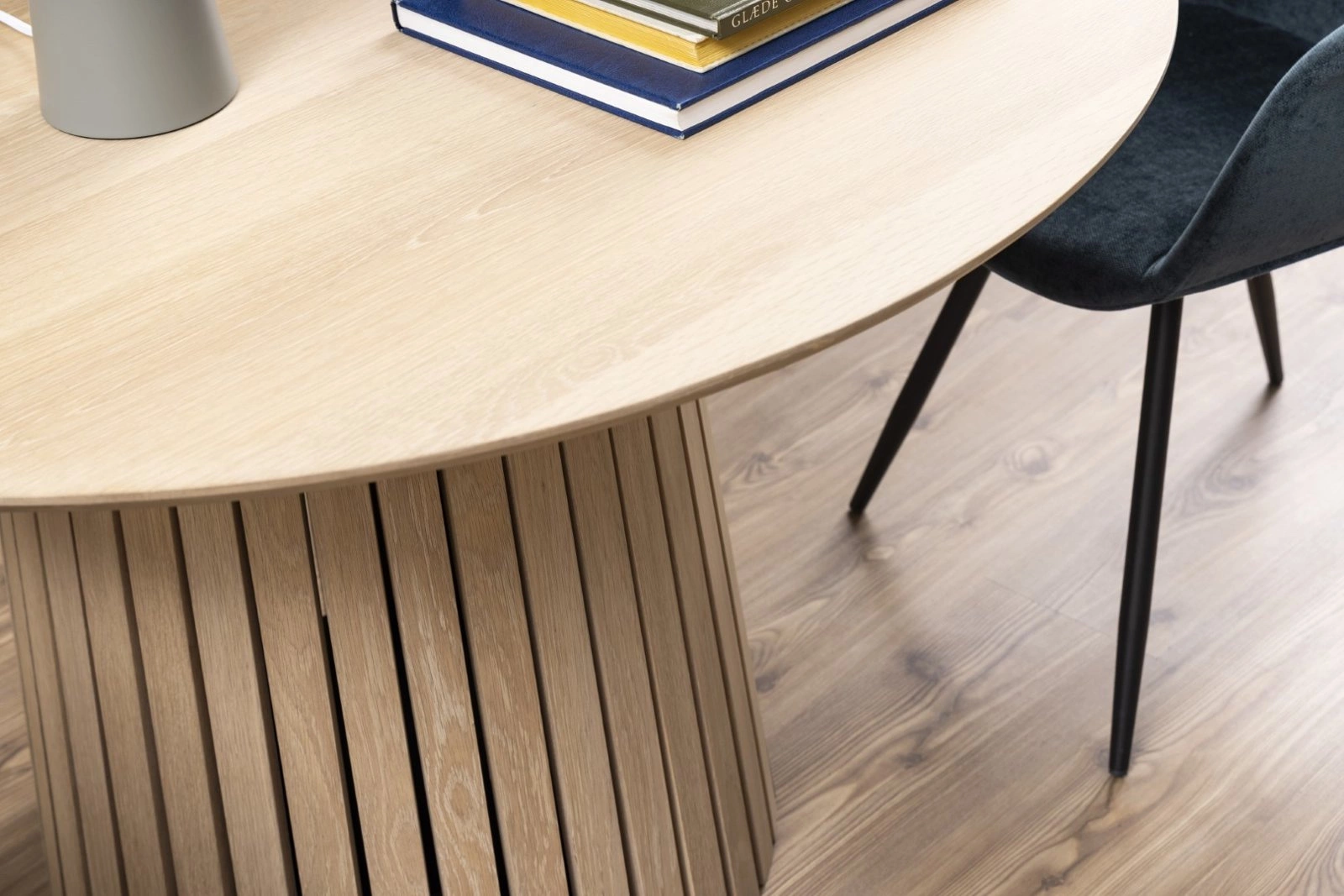 - Stół wykonany jest z bielonego forniru dębowego, dzięki czemu stanowi doskonałe uzupełnienie wnętrz o różnorodnym wystroju.