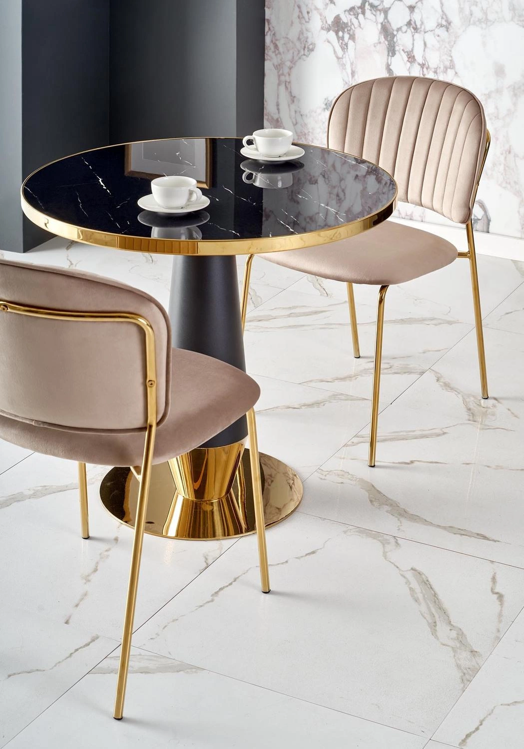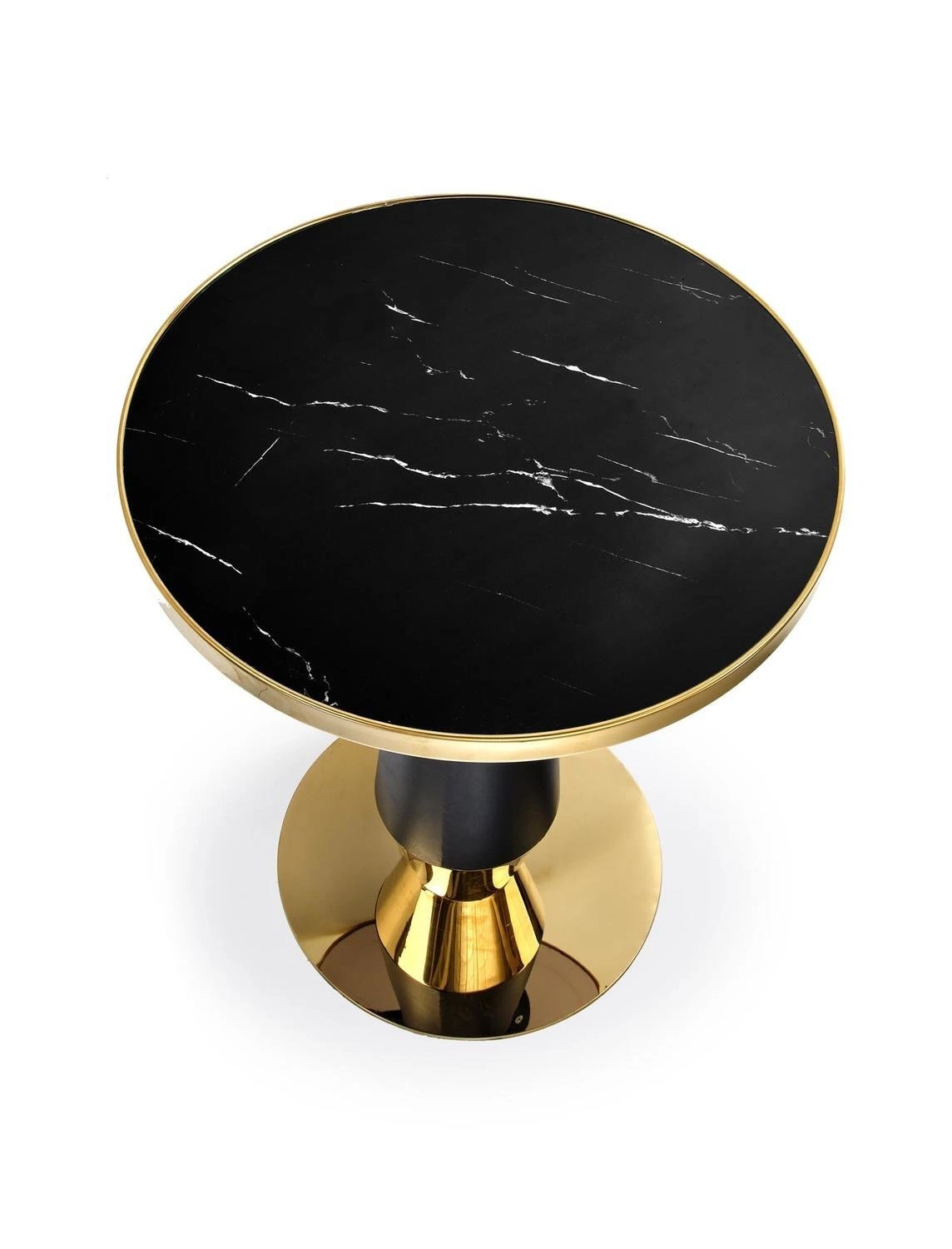 Blat stołu w kolorze czarnego marmuru dodaje mu eleganckiego wyglądu, który z pewnością przypadnie do gustu każdemu miłośnikowi stylowego designu. Noga w kolorze czarnym lub złotym dodaje jeszcze więcej klasy i stylu, dzięki czemu ten stół będzie idealnym wyborem do Twojego wnętrza. Nie tylko wygląd, ale również funkcjonalność jest godna uwagi. Okrągły kształt blatu zapewnia wygodne miejsce do spożywania posiłków lub picia kawy, a jedna noga zapewnia stabilność i wytrzymałość.