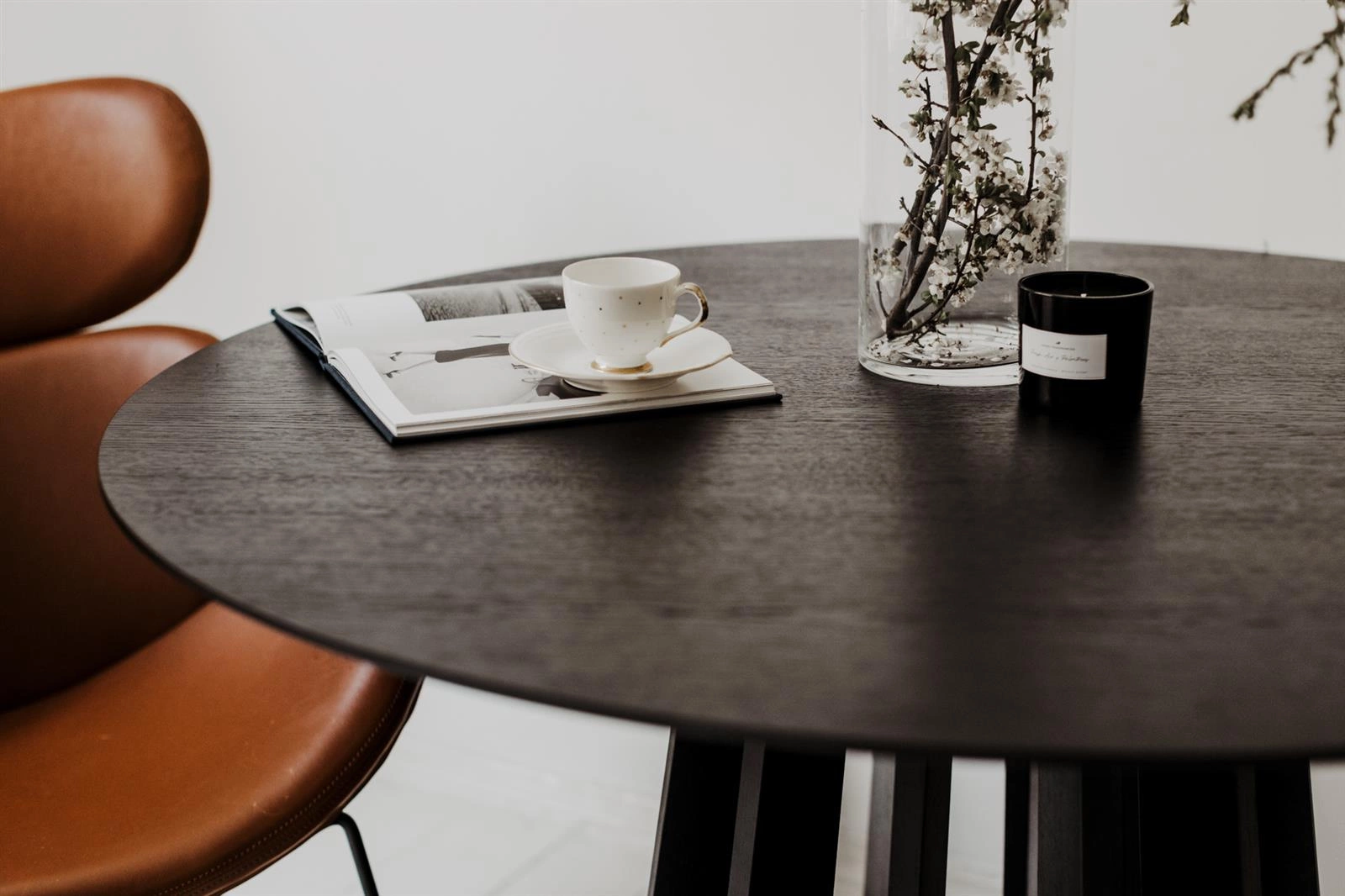 Solidnie zabezpieczony lakierem blat stołu Tavle odporny jest na wysoką temperaturę stawianych na nim naczyń, wilgoć oraz odbarwienia. Są to ważne cechy, które powinien posiadać stół do jadalni. Udoskonalone są także dzięki podstawie z litego drewna dębowego o czarnym wybarwieniu, pokrytego lakierem. Pionowe elementy zwarte metalową obręczą malowaną proszkowo w odcieniu AXALTA RAL 9005 o drobnej strukturze tworzą jednolitą nogę. Taka konstrukcja zapewnia odpowiednią stabilność i wytrzymałość, dzięki czemu stół posłuży na lata.