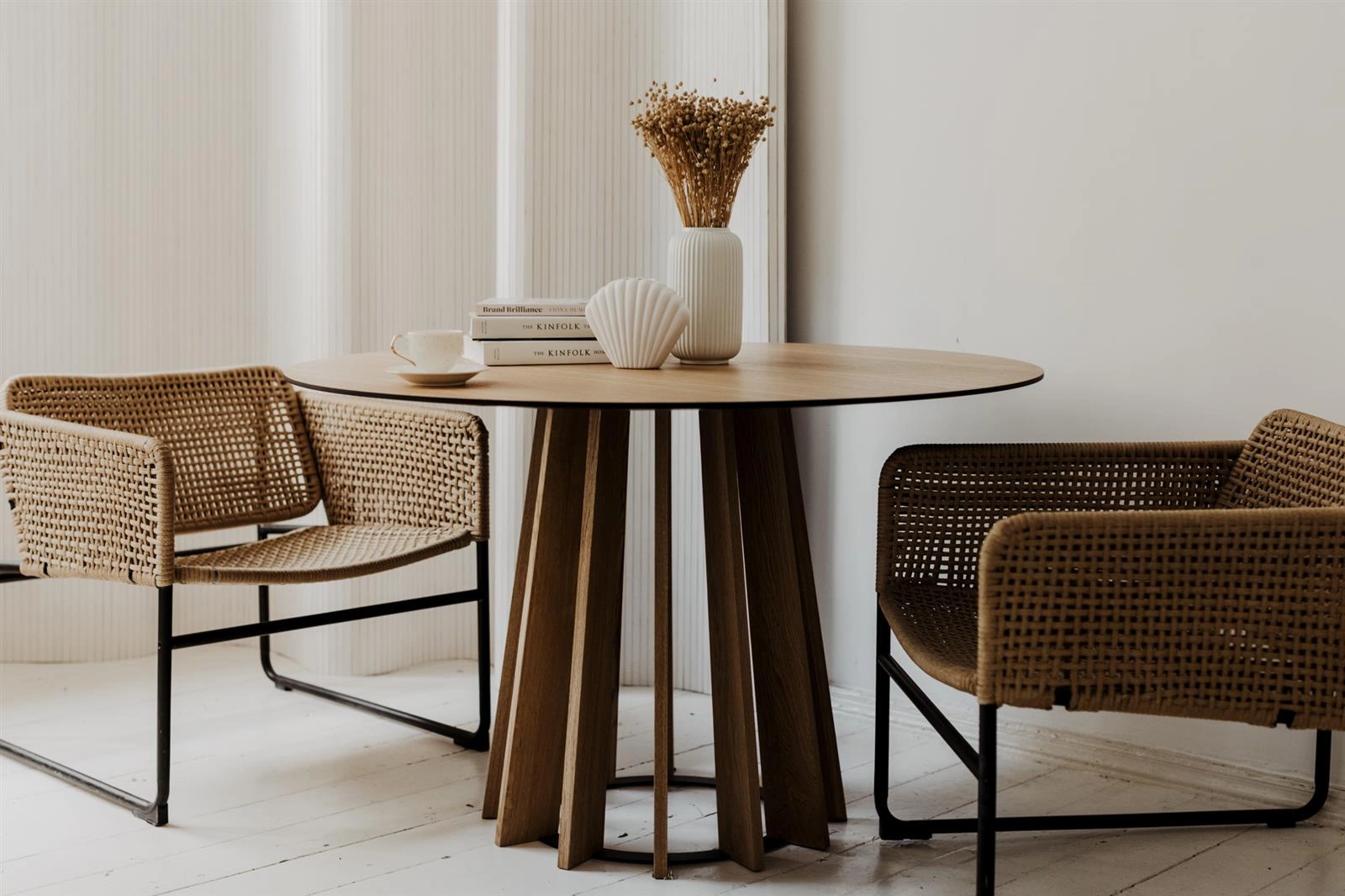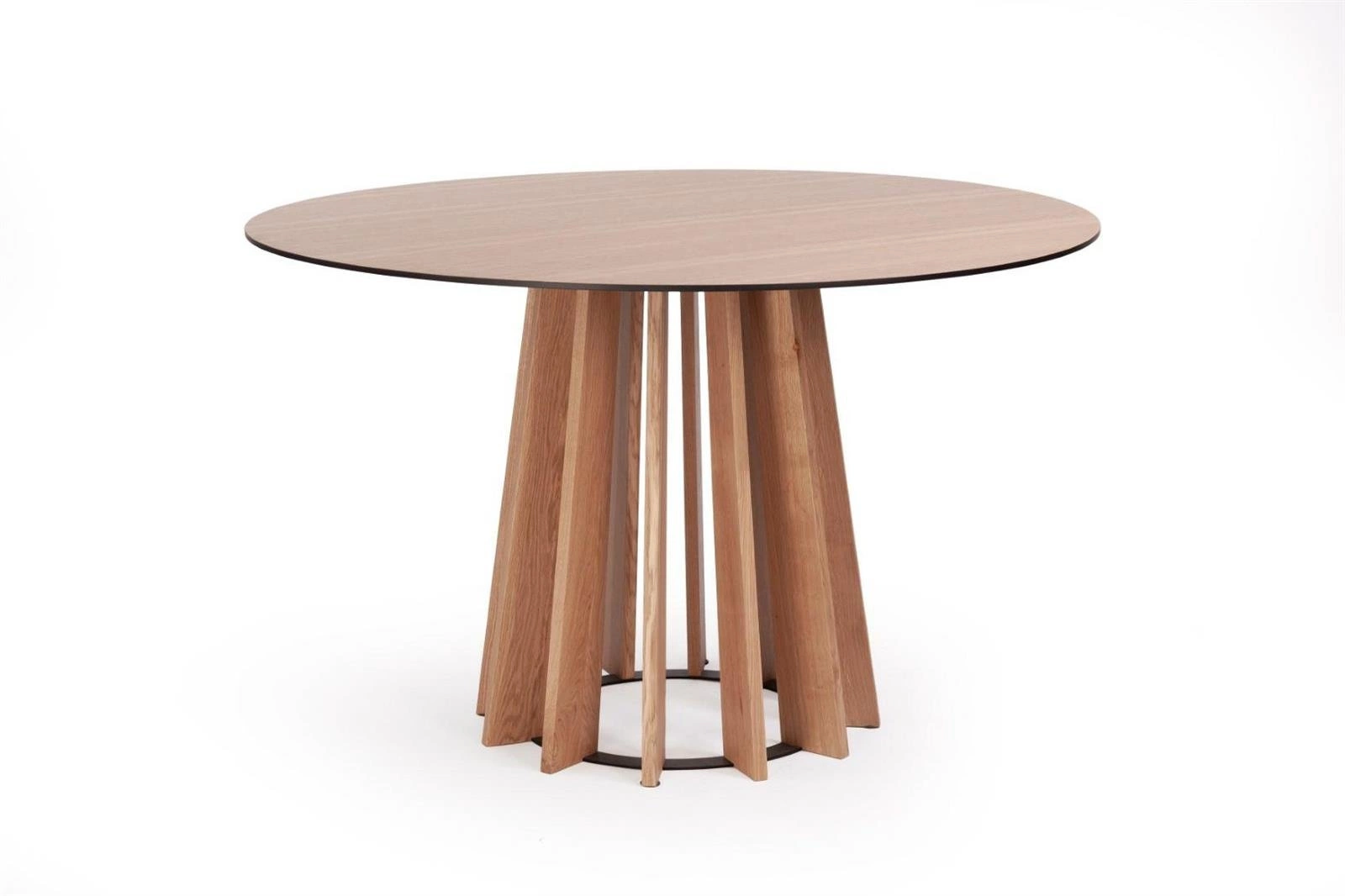 Stół Tavle wyróżnia się nowoczesnym stylem skandynawskim, który łączy ciepło naturalnego drewna z geometryczną, wyważoną formą. Fornir dębowy w odcieniu naturalnym nadaje mu elegancji i przytulności, a centralna noga wykonana z drewna i metalu podkreśla lekkość i stabilność konstrukcji. Takie połączenie sprawia, że ten stół okrągły idealnie wpasuje się w jasne, przestronne wnętrza, w których liczy się zarówno estetyka, jak i wygoda codziennego użytkowania.