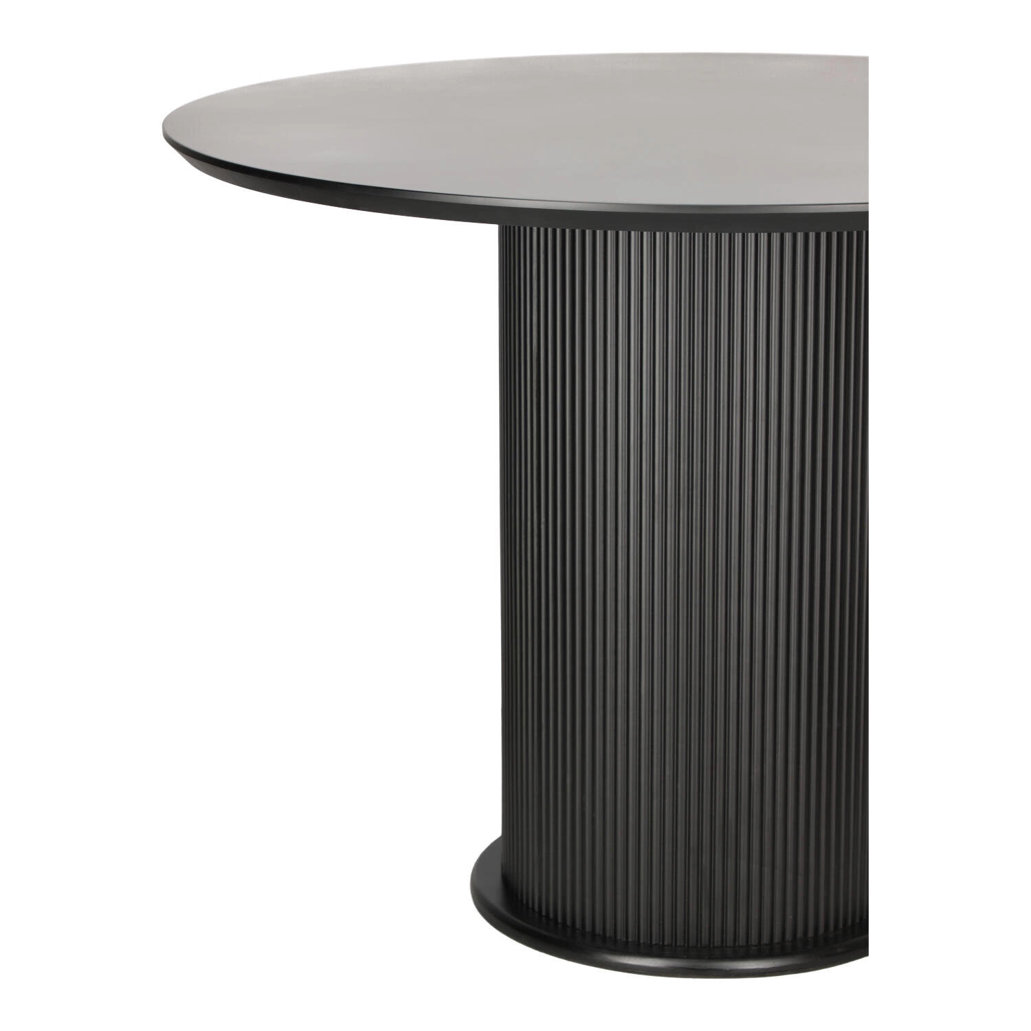Stół został wykonany z wytrzymałego połączenia melaminy i płyty MDF, co gwarantuje jego trwałość i odporność na uszkodzenia. Blat stołu pokryty jest melaminą, która nie tylko jest trudnopalna, ale również wyjątkowo odporna na działanie wody, wysokich temperatur oraz promieniowanie świetlne. Podstawa stołu, ozdobiona lamelami, wykonana została z frezowanej płyty MDF, co dodaje mu niepowtarzalnego charakteru. Stylowy design stołu, w połączeniu z klasycznym wykończeniem w kolorze czarnym, sprawia, że mebel ten doskonale wpisuje się w różnorodne aranżacje wnętrz. Idealnie sprawdzi się zarówno w salonie, jako miejsce spotkań z rodziną i przyjaciółmi, jak i w przestrzeni jadalnianej, tworząc elegancką atmosferę.