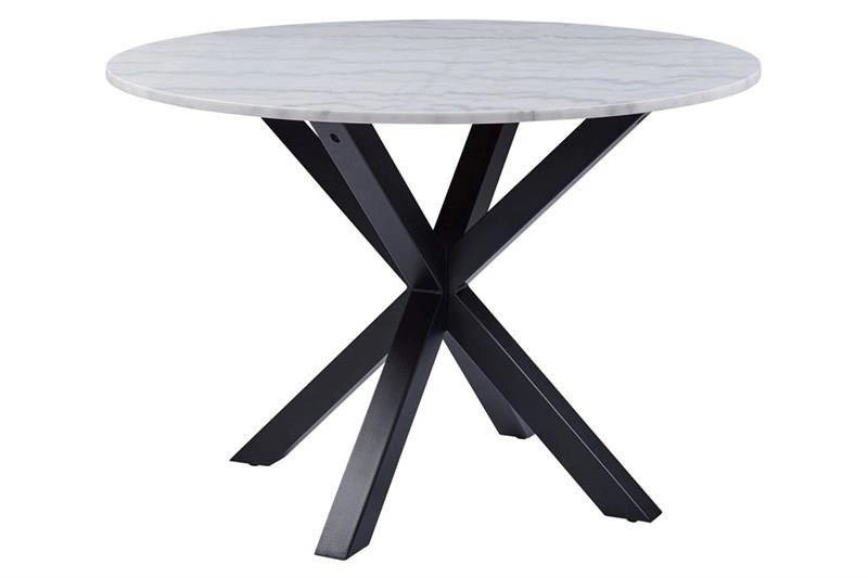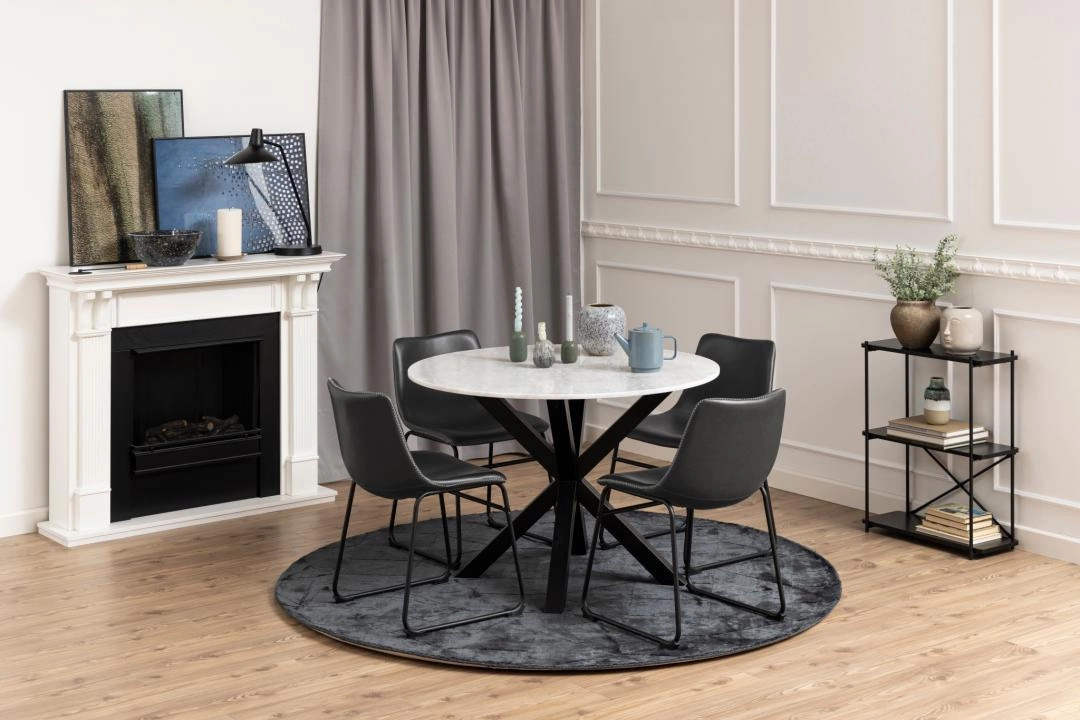 Stół Heaven to połączenie płyty MDFz metalem. Podstawę stanowią ciekawie ułożone metalowe nogi, malowane proszkowo na kolor czarny. Blat wykonany został z płyty MDF wykończonej okleiną marmurową. Stół doskonale sprawdzi się w każdym pomieszczeniu, a dodatkowo wprowadzi do niego ciekawy design w przystępnej formie.