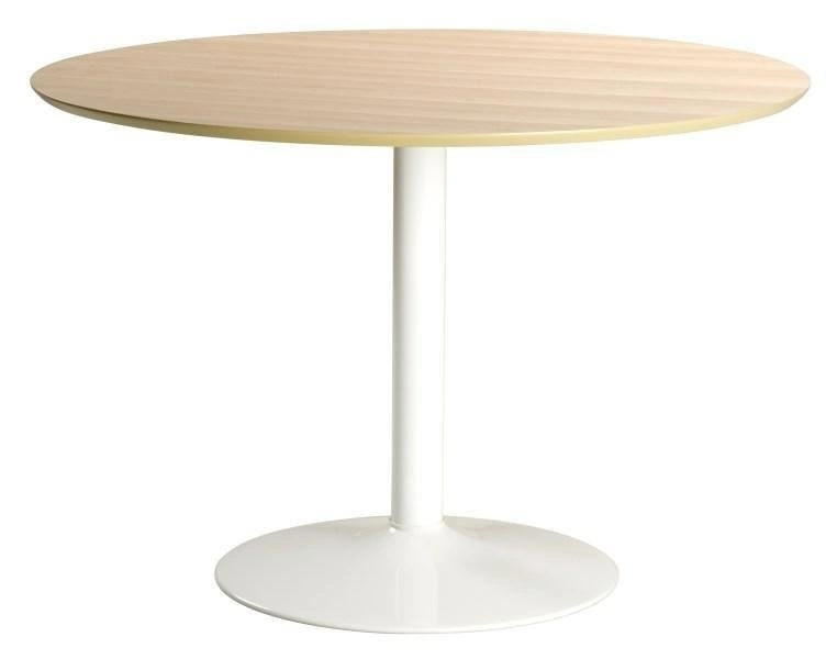 Nowoczesny stół Ibiza w stylu bistro to okrągły mebel do jadalnego kącika w salonie, czy też większej kuchni. Dużych rozmiarów stół ma metalową, w całości pomalowaną na biało podstawę w formie słupka na okrągłej stopce. Okrągły blat wykonany jest z płyty mdf pokrytej dębowym fornirem. Blat ma naturalny, ciepły odcień drewna i ładnie wyeksponowane usłojenie. Połączenie bieli i naturalnego koloru drewna wpisuje stół w styl skandynawski. Ta neutralna kolorystyka pozwala łatwo zaaranżować go we wnętrzu pozwalając na dowolne zestawienia kolorystyczne.