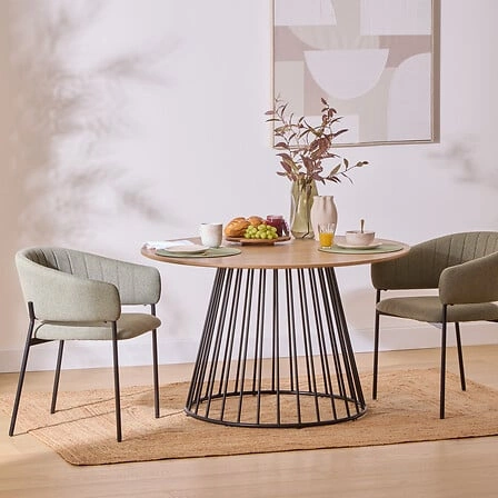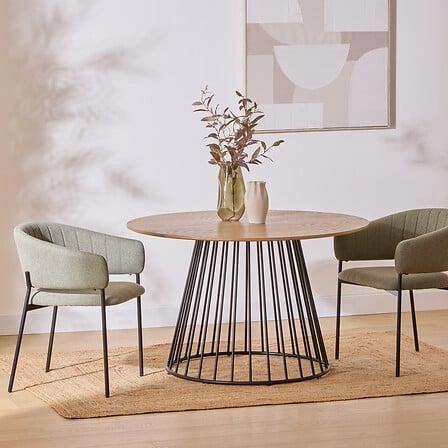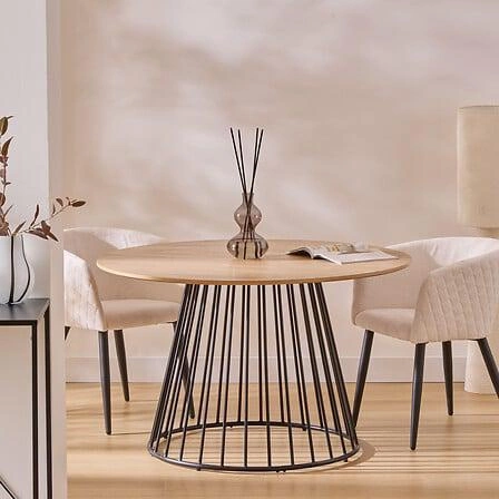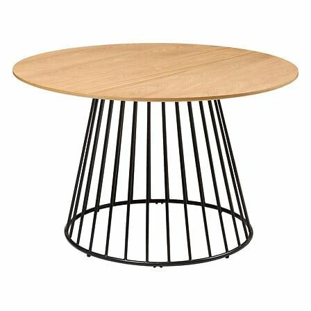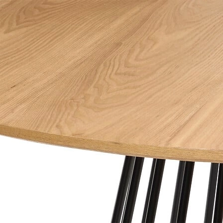 Stół o fornirowanym drewnem jesiony blacie oraz czarnej, metalowej podstawie sprawdzi się przede wszystkim we wnętrzu stawiającym na naturę. Stół o okragłym blacie w kolorze drewna jest niezwykle ozdobnym meblem. Blat wykonany został blatu fornirowanego drewnem jesionu. Okrągła podstawa stołu z pionowymi wspornikami polakierowana została proszkowo na kolor czarny.
