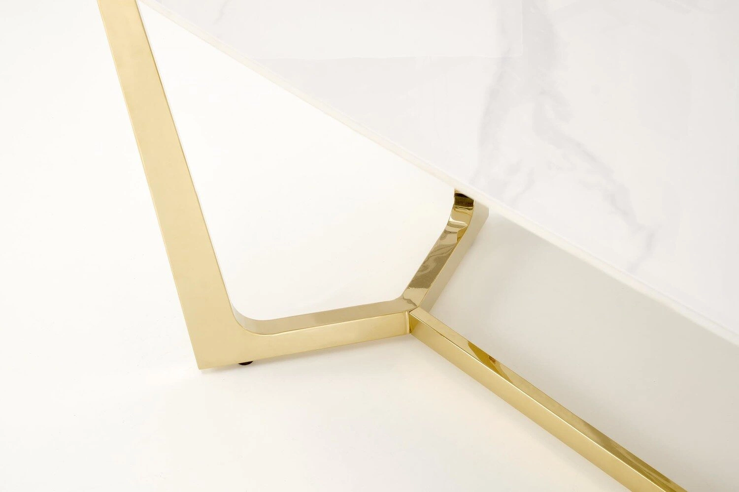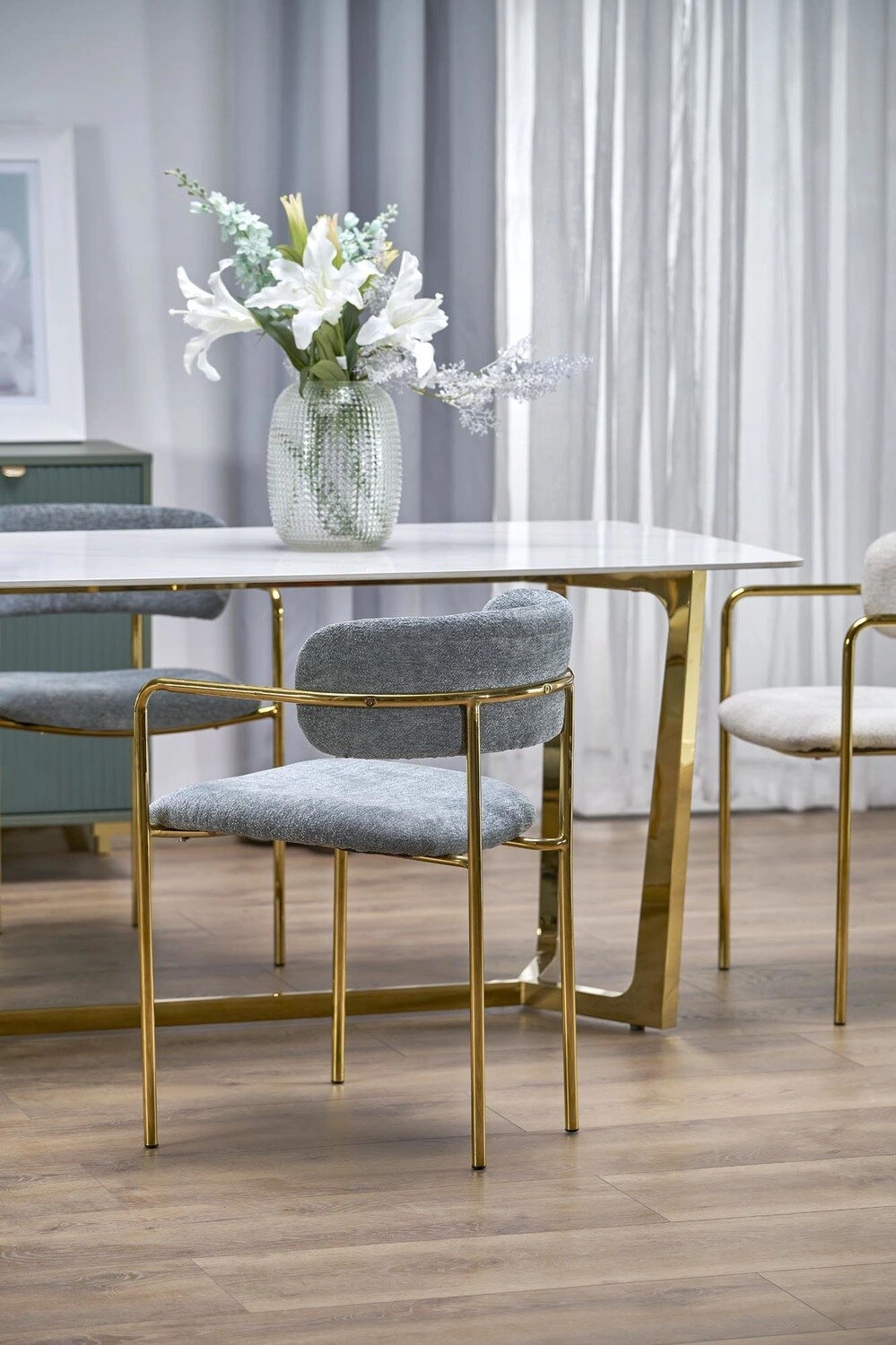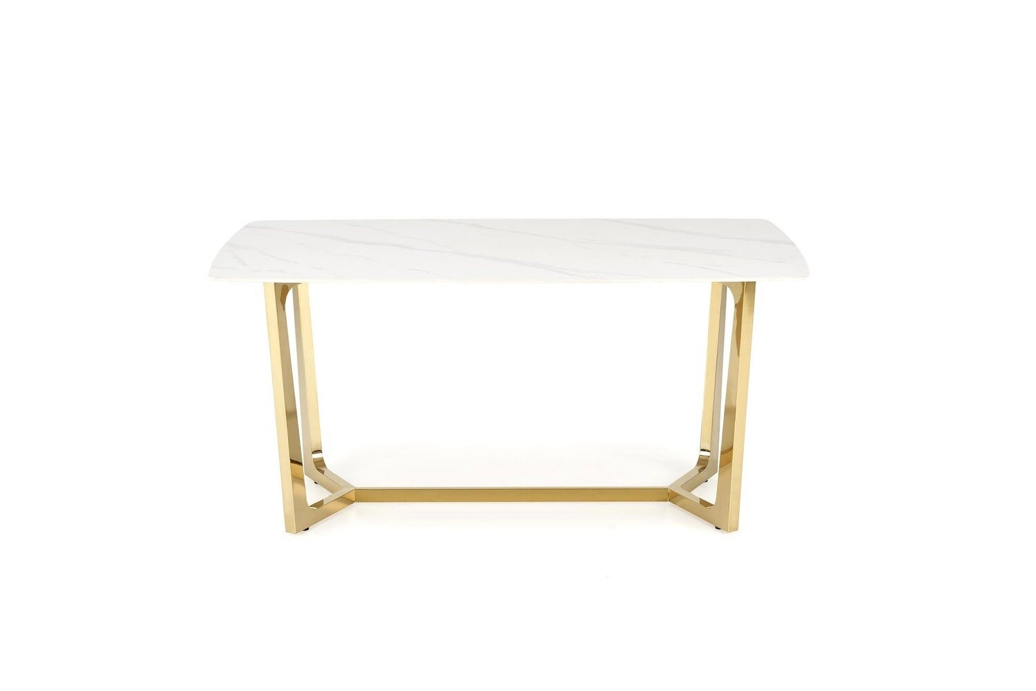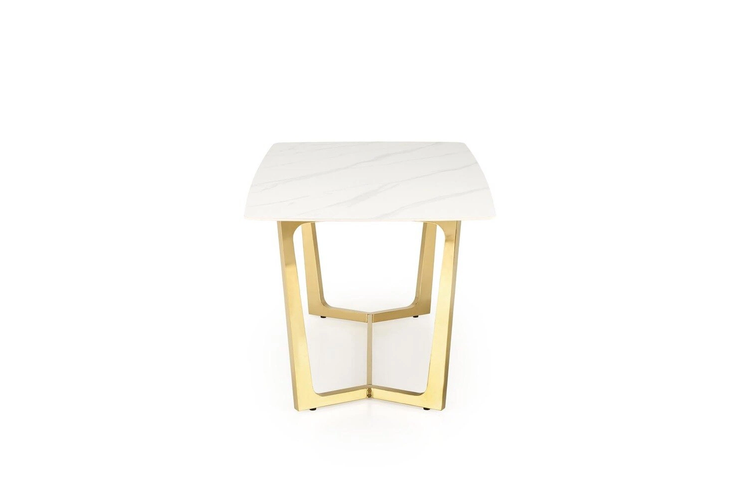 Blat stołu wykonany jest z wysokiej jakości spieku imitującego marmur, co nie tylko nadaje mu estetycznego uroku, ale również zapewnia trwałość i łatwość w utrzymaniu czystości. Marmurowy efekt dodaje elegancji i klasy, idealnie komponując się z nóżkami w złotym odcieniu ze stali nierdzewnej. Te elementy podkreślają luksusowy charakter stołu, jednocześnie będąc praktycznym wyborem na lata.