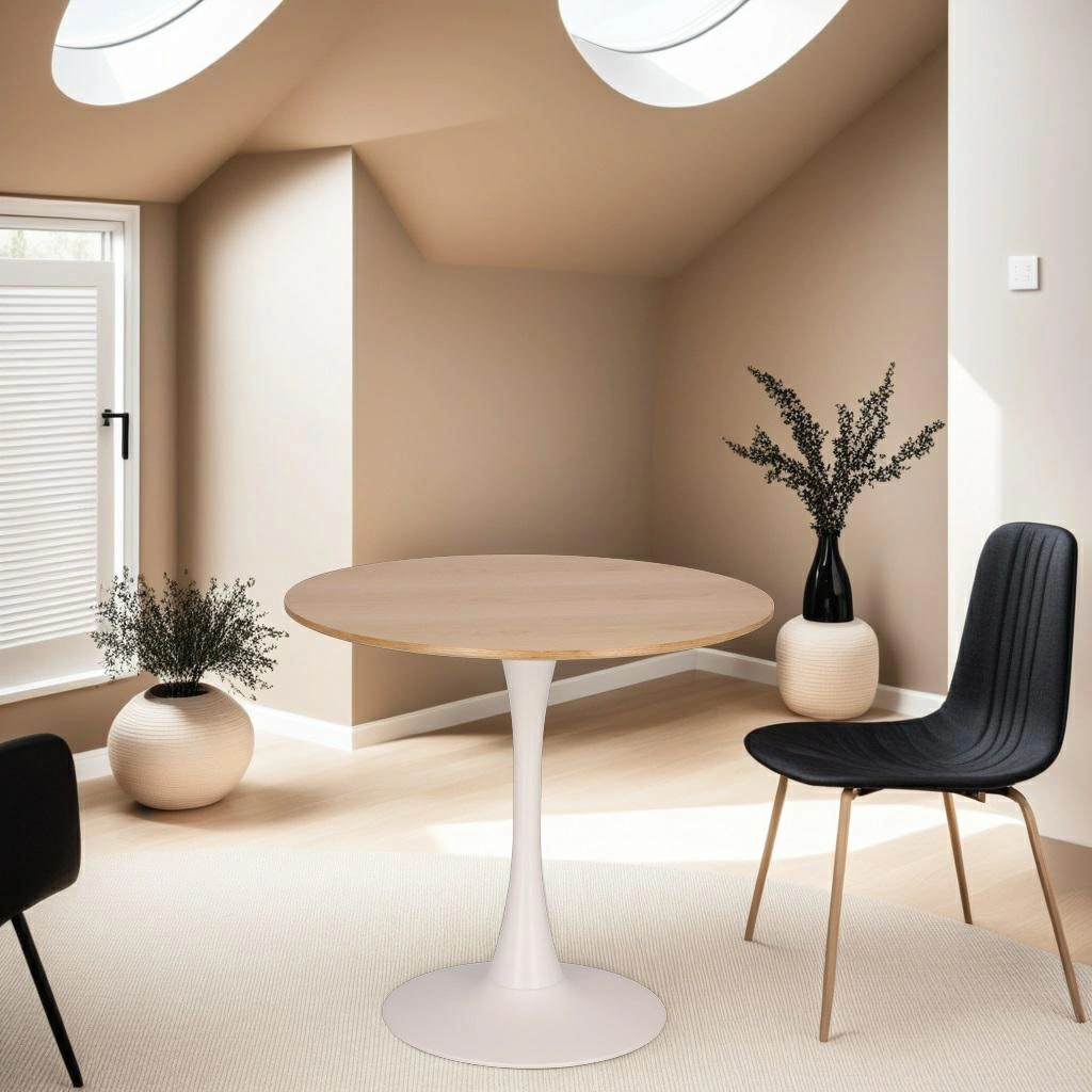 Stół Simplet Skinny z okrągłym blatem to doskonałe połączenie nowoczesności, elegancji i funkcjonalności. Jego innowacyjny design z centralnie umieszczoną nogą w kształcie trąbki, malowaną proszkowo, czyni go idealnym wyborem zarówno do małego mieszkania, jak i stylowej restauracji. Jedna noga, umieszczona centralnie pod blatem, to uniwersalne rozwiązanie, które pozwala na swobodne rozmieszczenie krzeseł bez obawy o kolizje z tradycyjnymi nogami stołu. Dzięki temu stół Simplet Skinny jest niezwykle praktyczny i wszechstronny.