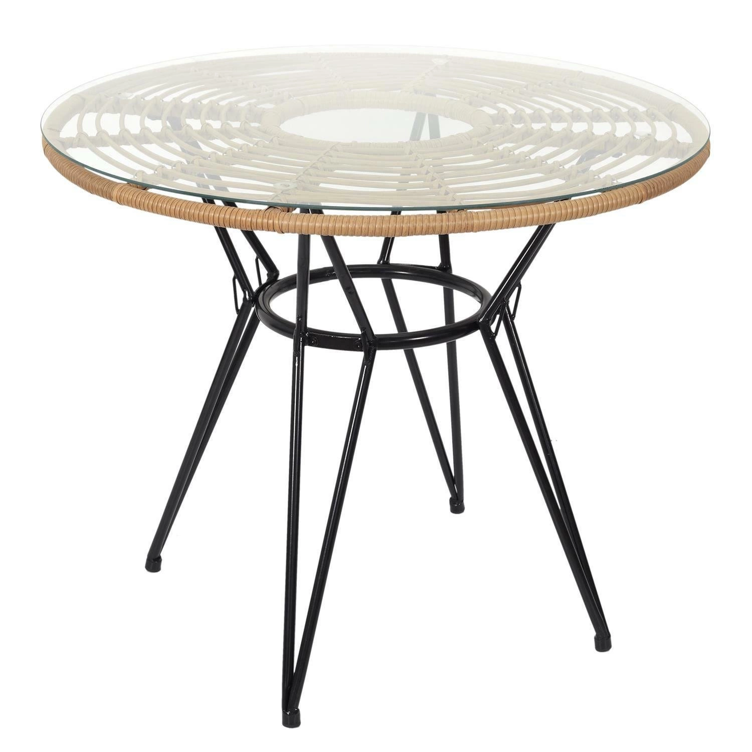 Stół Surabaya posiada duży, okrągły blat o średnicy 90 centymetrów. Jego wierzchnia część wykonana jest ze szkła. Pod spodem znajduje się natomiast dekoracyjna plecionka ze sztucznego rattanu.