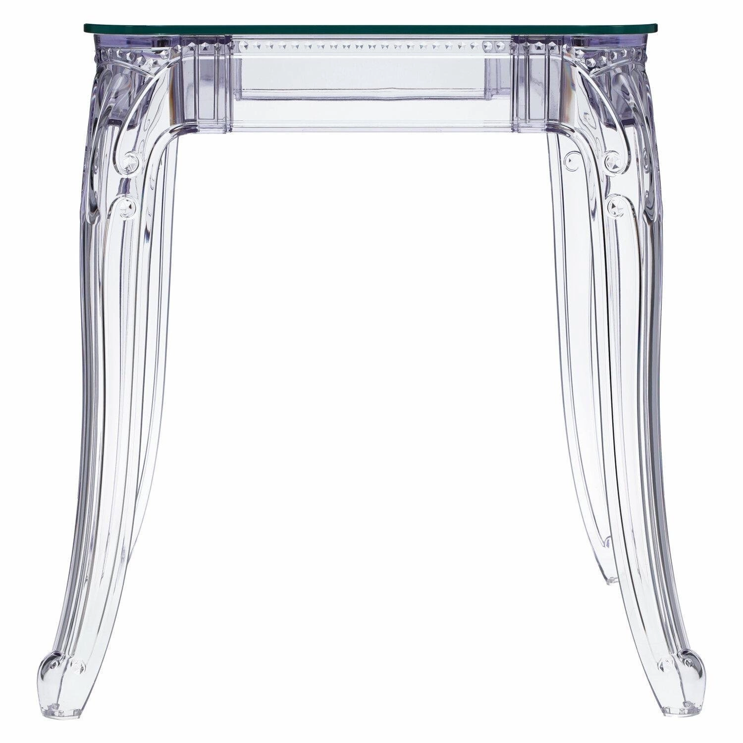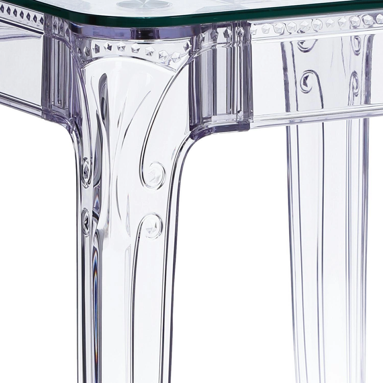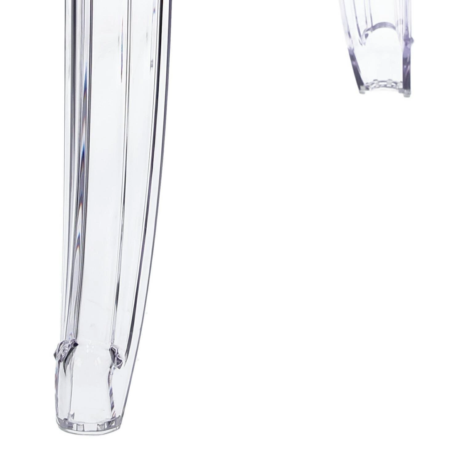 Stół Ghost to połączenie klasycznej wręcz barokowej formy oraz nowoczesnej techniki i wytrzymałych materiałów. Stół Ghost posiada szklany blat o grubości 10 mm, który podpierają bogato zdobione poliwęglanowe nogi. Poliwęglan to bardzo wytrzymałe tworzywo o szerokim zastosowaniu. Dzięki temu, że nogi stołu zostały zrobione ze sztucznego tworzywa, są one odporne na wilgoć. Szklany blat stołu dodaje mu lekkości, a wykorzystanie szkła sprawia, iż blat odporny jest na ciepło. Na stole możemy śmiało stawiać gorące naczynia bez obawy, iż blat się odparzy. Ghost to doskonały stół do małej jadalni, kuchni lub salonu. Przezroczysta forma mebla sprawia, iż nie przytłacza on pomieszczenia, a wręcz odbija światło i wnętrze wydaje się większe. Stół dostępny jest w dwóch rozmiarach. Grubość blatu: 10 mm Grubość nóg: od 5 do 8,5 cm