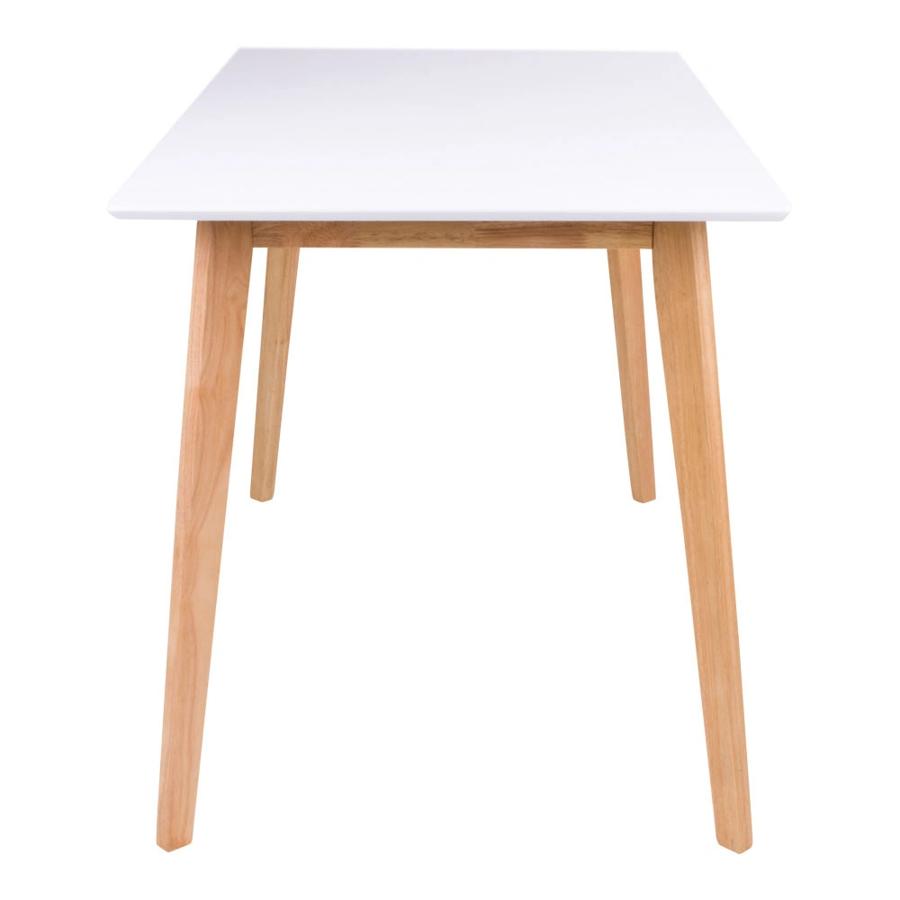 Vojens został zaprojektowany w duchu skandynawskiego minimalizmu – prosty, jasny i pozbawiony zbędnych zdobień. Biały blat w półmatowym wykończeniu optycznie rozjaśnia wnętrze, a naturalne drewniane nogi ocieplają aranżację. Taki duet sprawia, że stół świetnie wpisuje się w nowoczesne wnętrza, ale równie dobrze pasuje do przytulnej, jasnej jadalni czy kuchni w stylu nordic.
