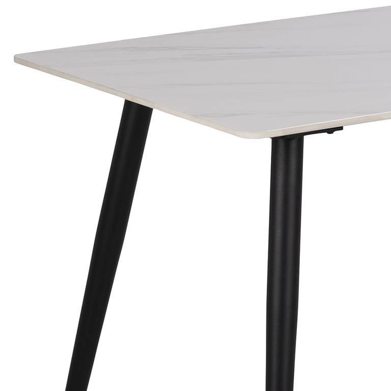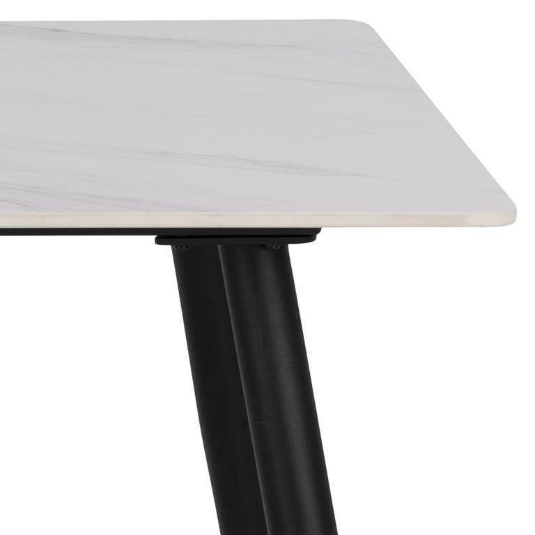 Twoje wnętrza wypełnia wyposażenie utrzymane w duchu minimalizmu? Stół ceramiczny Wicklow z pewnością przypadnie Ci do gustu! Wyróżnia go przede wszystkim ponadczasowe połączenie wysokiej jakości materiałów z subtelną i lekką konstrukcją. Stół posiada blat wykonany z płyty ceramicznej udekorowanej printem imitującym marmur. Jego subtelną formę podkreślają zaokrąglone rogi, które zaprojektowane zostały, by dbać o bezpieczeństwo użytkowników. Marmurowy blat podpierają cztery smukłe nogi z metalu malowane proszkowo na czarno. Zaokrąglenia na ich końcach sprawiają, że metal nie wygląda zbyt surowo, a całość ma elegancki i stylowy charakter. Stół Wicklow to propozycja do jadalni w stylu glamour bądź nowoczesnej restauracji. Doskonale odnajdzie się także w klimacie wnętrz industrialnych i nowoczesnych.