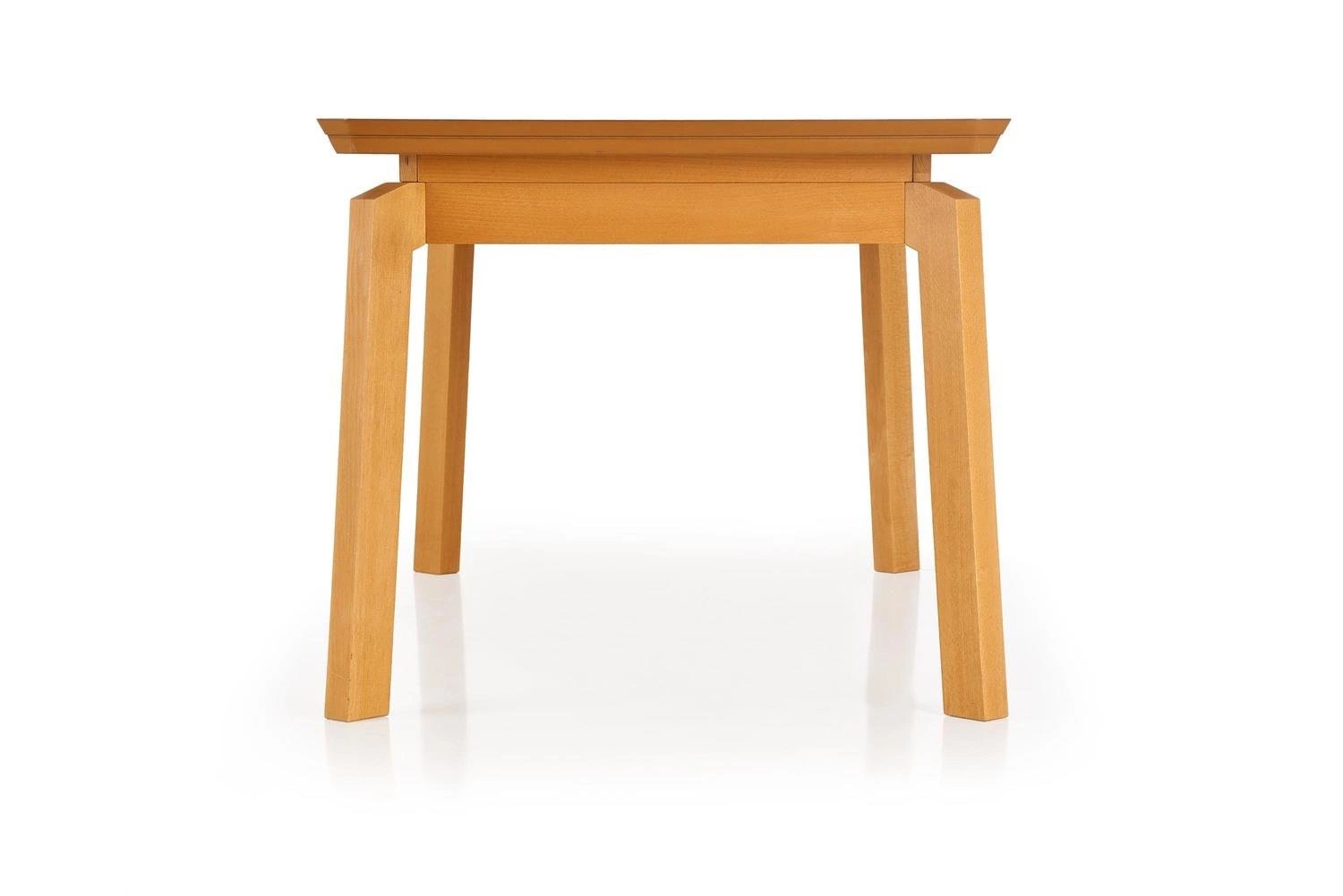 Blat wykonany z MDF i okleiny naturalnej jest nie tylko trwały i łatwy w utrzymaniu czystości, ale również pięknie prezentuje się dzięki wykończeniu w kolorze dębu miodowego. Drewniane nogi z litego buku dodają meblowi elegancji i stabilności. Stół rozkładany to także świetna inwestycja dla osób, które cenią sobie oszczędność miejsca. Po złożeniu zajmuje on znacznie mniej przestrzeni, co pozwala na swobodne poruszanie się po pomieszczeniu.