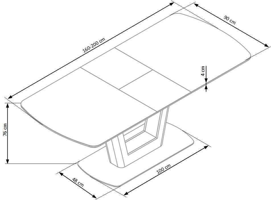 Blat stołu jest prostokątny i wykonany ze szkła oraz MDF lakierowanego, co daje wiele możliwości aranżacyjnych. Stół rozkładany jest w kolorze antracyt matowy oraz orzech, co pozwala na dopasowanie go do różnych stylów wnętrz. Wysokość stołu wynosi 76 cm, a jego długość i szerokość wynoszą odpowiednio 160-200 cm i 90 cm.