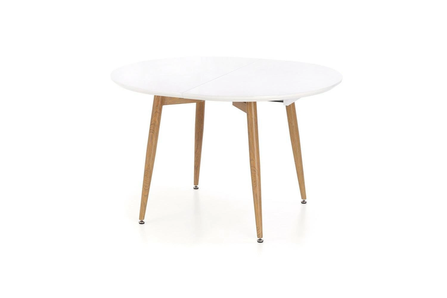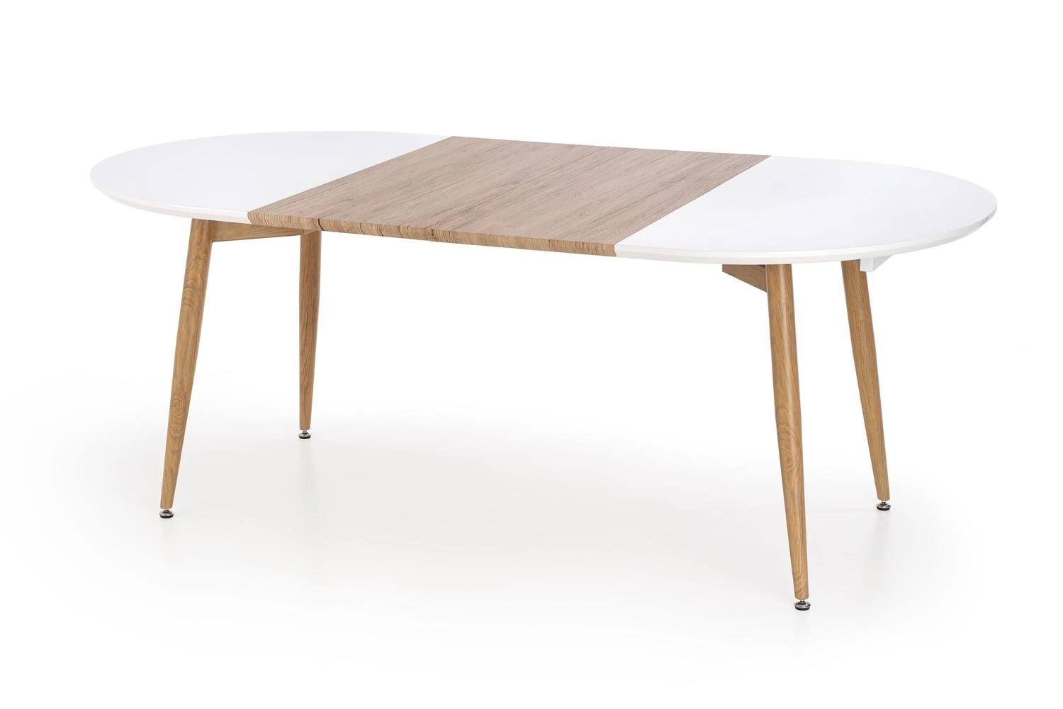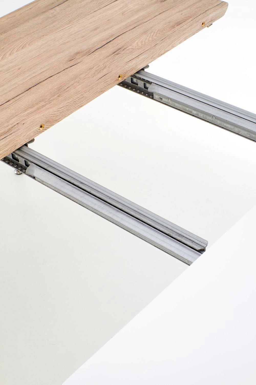 Stół jest wykonany z wysokiej jakości materiałów, takich jak MDF lakierowany i laminowany oraz stal malowana, co zapewnia jego trwałość na długie lata. Kolor biały matowy w połączeniu z dębowym wykończeniem san remo dodaje elegancji i klasy temu meblowi. Wysokość stołu wynosi 76 cm, co zapewnia wygodne miejsce do jedzenia dla całej rodziny.Stół posiada rozkładany blat, co pozwala na elastyczność w organizowaniu przyjęć i spotkań rodzinnych.