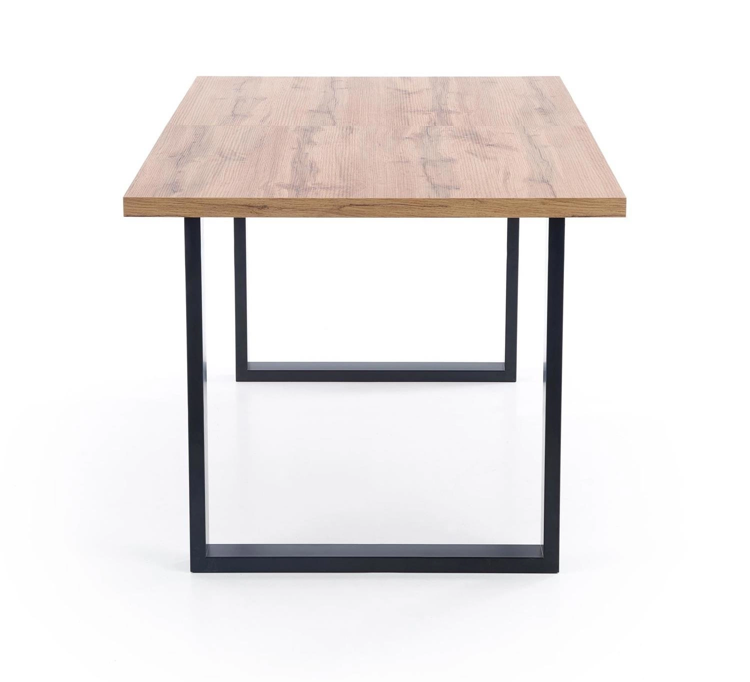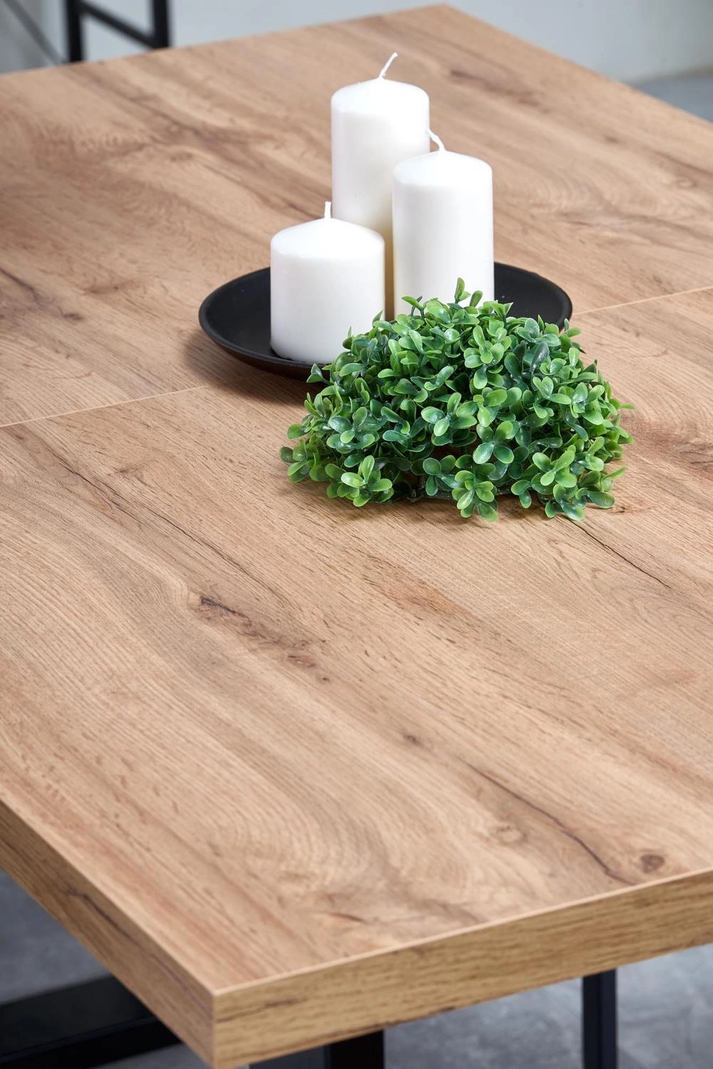 Blat stołu został wykonany z płyty meblowej laminowanej imitującej dąb wotan, co gwarantuje trwałość i odporność na uszkodzenia mechaniczne. Obrzeża zostały dodatkowo wzmocnione elementami ABS, co zwiększa ich wytrzymałość. Nogi stołu wykonane są z malowanej proszkowo stali, co zapewnia stabilność i solidność konstrukcji. Stół dostępny jest w dwóch kolorach - dąb wotan na blacie oraz czarny na nogach. Dzięki temu doskonale wpasuje się w nowoczesne, loftowe wnętrza, ale również w bardziej klasyczne aranżacje.