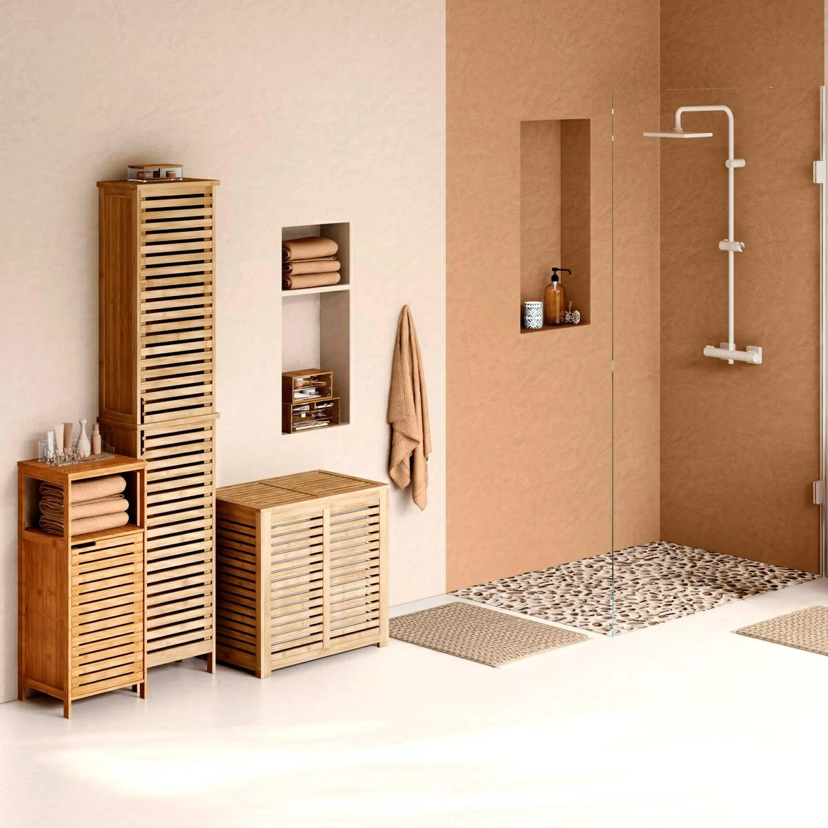 Szafka Sicela wyróżnia się nie tylko swoją funkcjonalnością, ale także estetyką. Wykonana z naturalnego bambusa, który jest ekologicznym materiałem o eleganckim wyglądzie, wnosi do wnętrza przyjemną atmosferę. Kombinacja jasnego koloru bambusa z subtelnymi wykończeniami nadaje meblowi unikatowego charakteru, który pasuje zarówno do nowoczesnych, jak i klasycznych aranżacji.