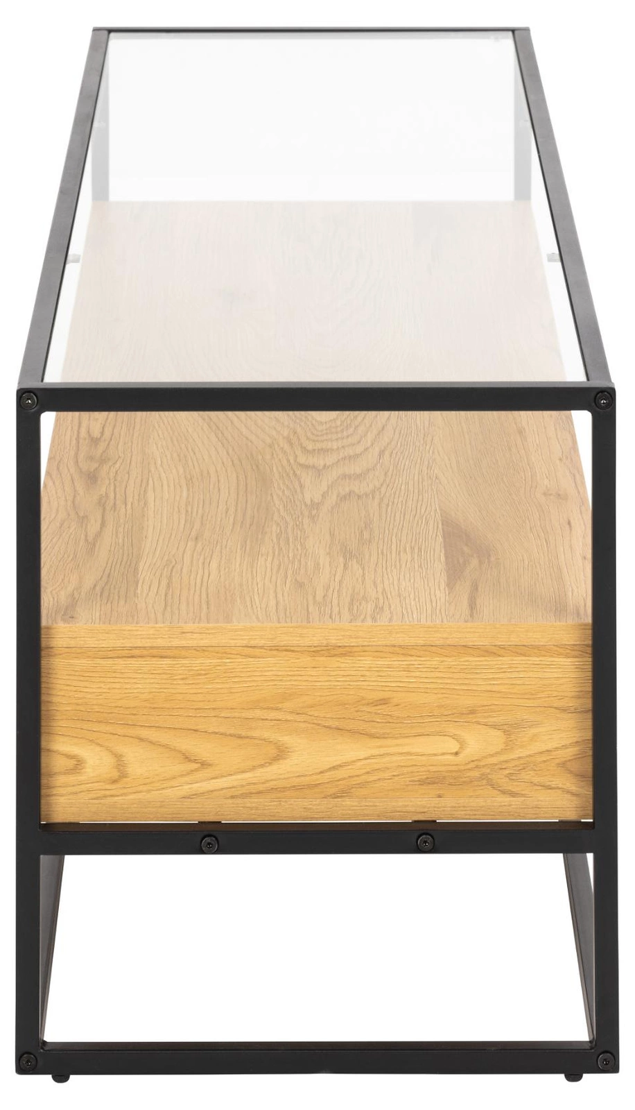 Szafka RTV Randolf marki Actona to nowoczesny mebel do salonu o szerokości 120 cm, który łączy w sobie transparentne szkło hartowane, stal malowaną proszkowo oraz naturalny akcent drewna dębowego. Kompaktowe wymiary (45 cm wysokości i 40 cm głębokości) sprawiają, że szafka idealnie sprawdzi się zarówno w przestronnym salonie, jak i w mniejszych mieszkaniach. Przemyślany układ trzech funkcjonalnych półek oraz otwór na przewody RTV ułatwiają organizację domowej strefy rozrywki.Nowoczesny design: szafka RTV do każdego wnętrza