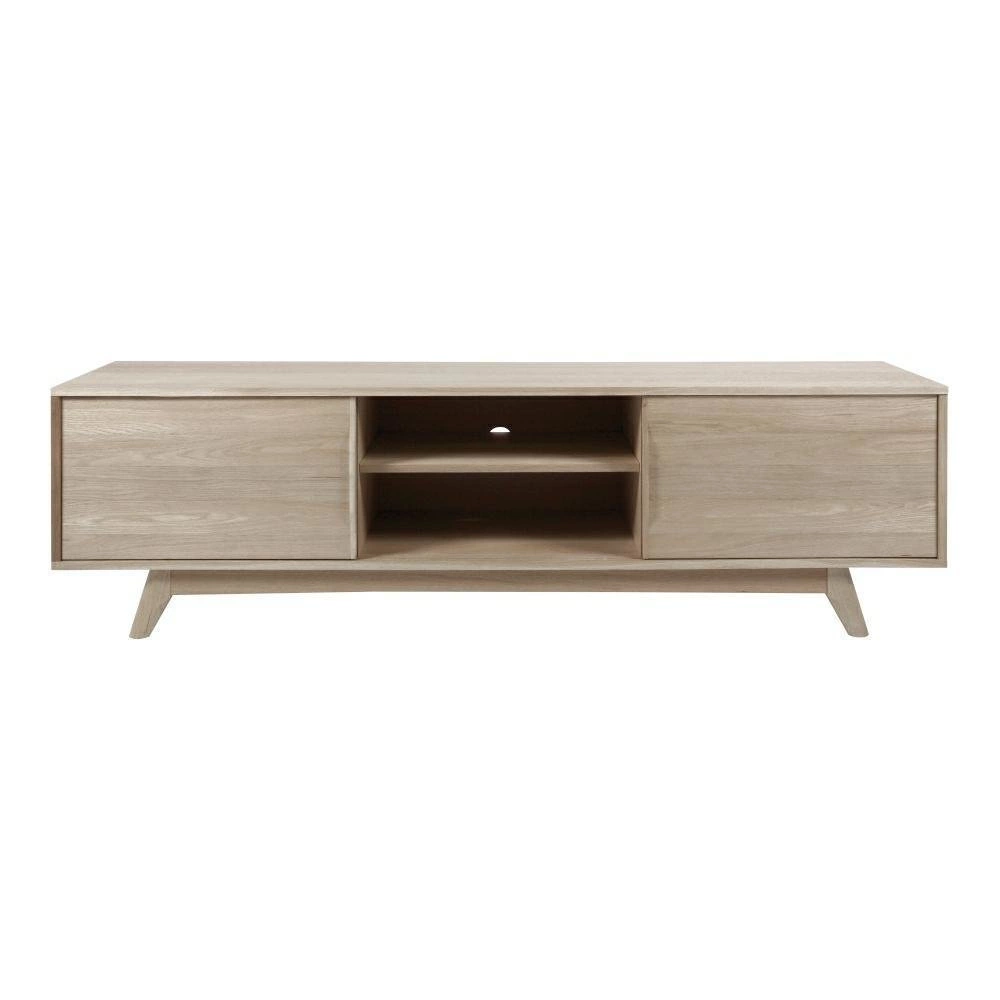 - Szafka RTV Marte z serii Marte wyróżnia się eleganckim wyglądem, który łączy naturalne piękno dębowego forniru z nowoczesnym bielonym wykończeniem