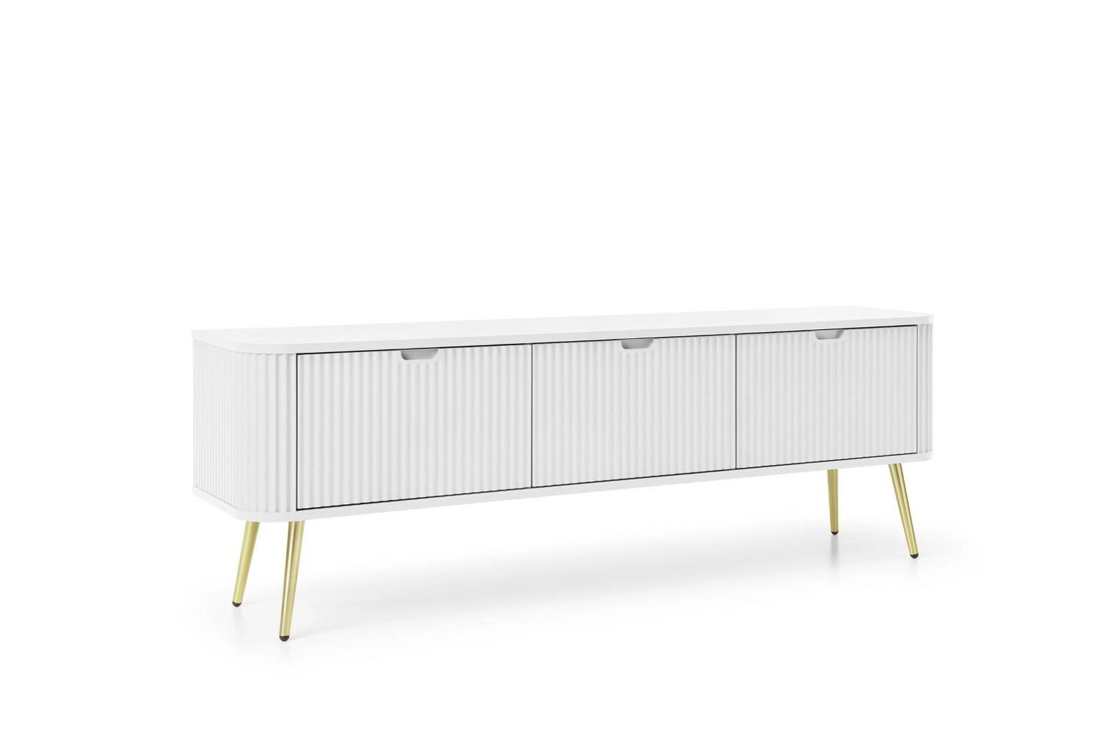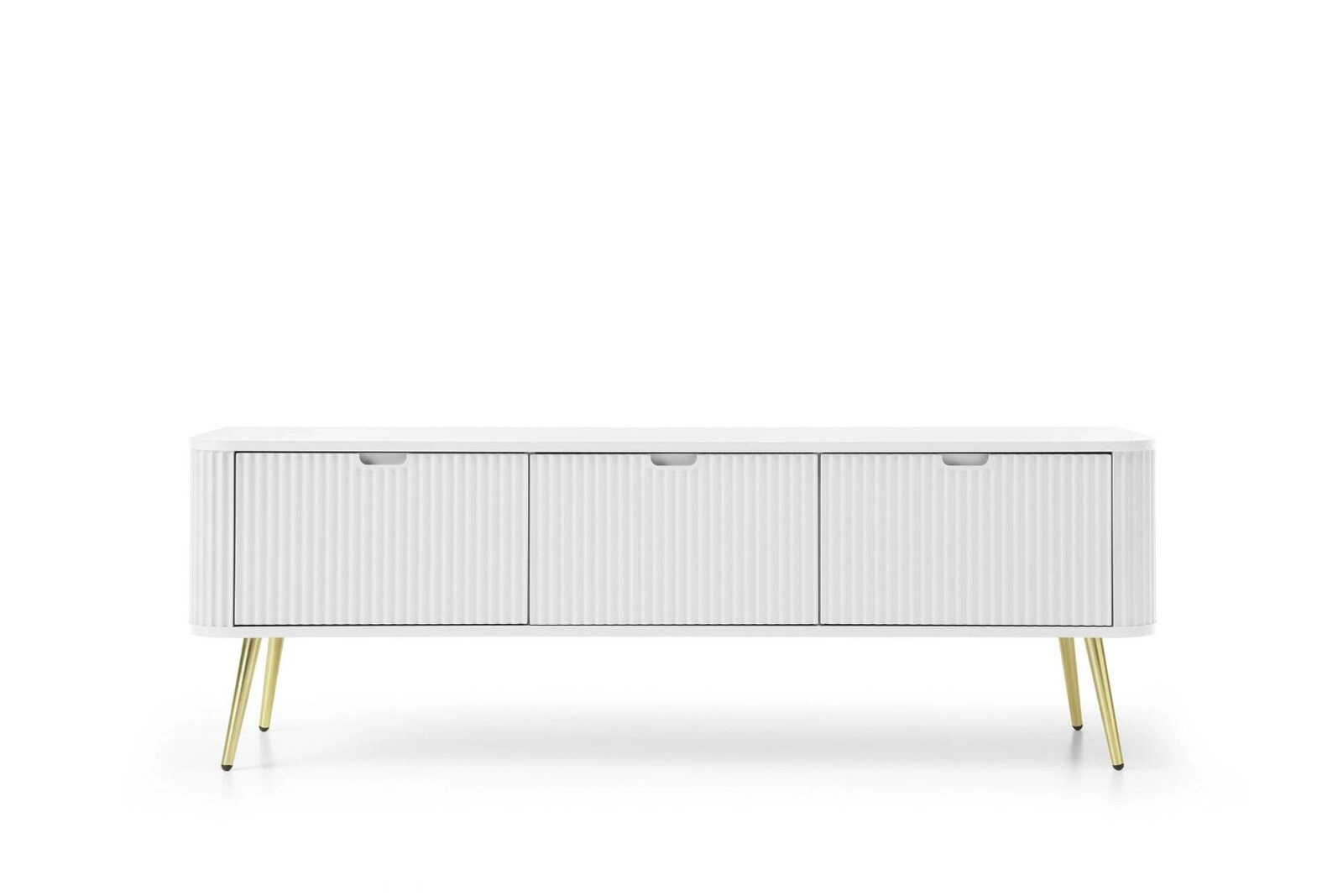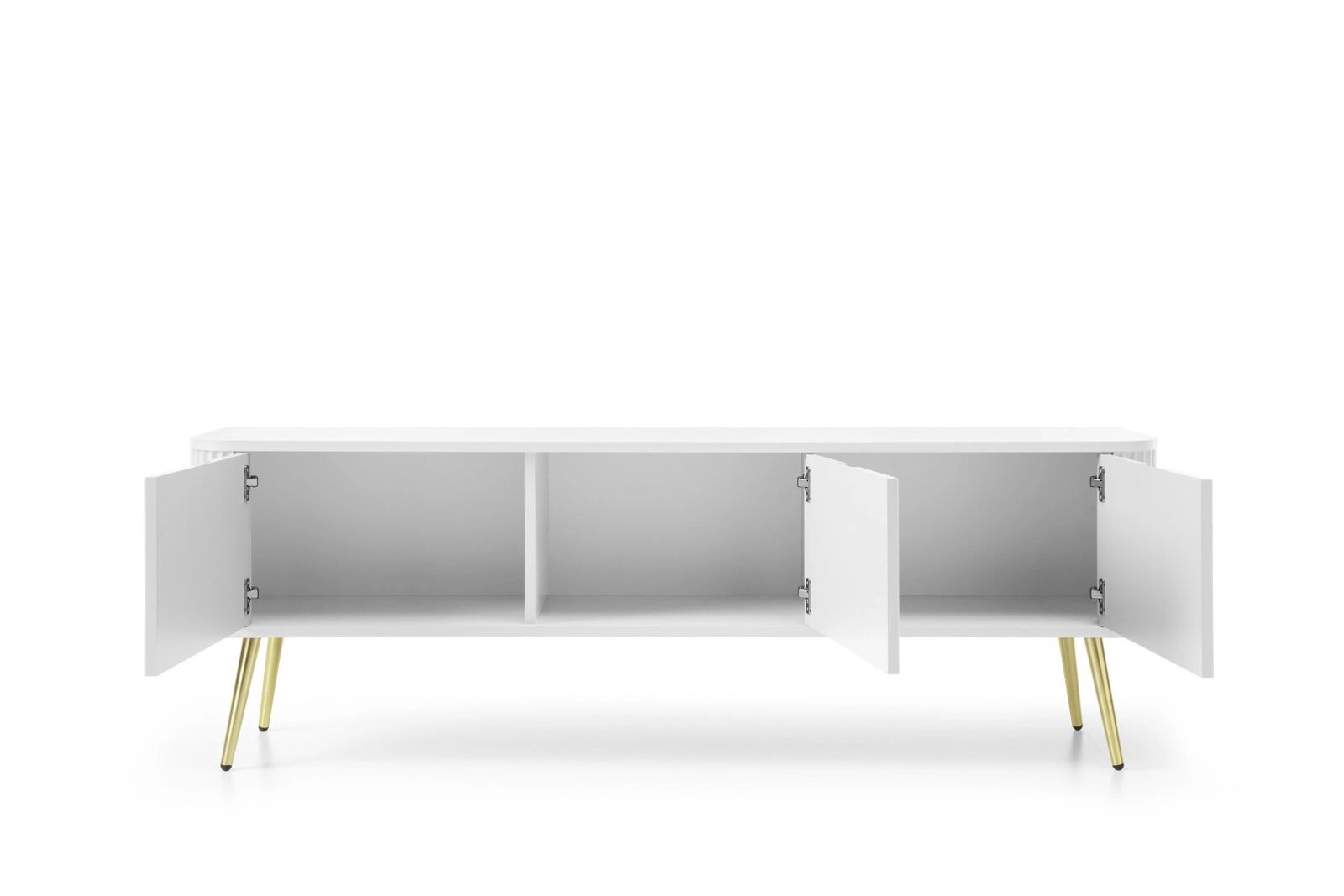 Szafka RTV Seda w kolorze białym z eleganckimi złotymi nogami to stylowy i funkcjonalny dodatek do każdego nowoczesnego wnętrza. Dzięki trzem frontom, szafka ta oferuje dużo miejsca do przechowywania niezbędnych akcesoriów multimedialnych, takich jak dekodery, konsole do gier, piloty czy kolekcje płyt. Jej minimalistyczny design sprawia, że doskonale komponuje się z różnymi stylami aranżacji, od skandynawskiego po glamour.