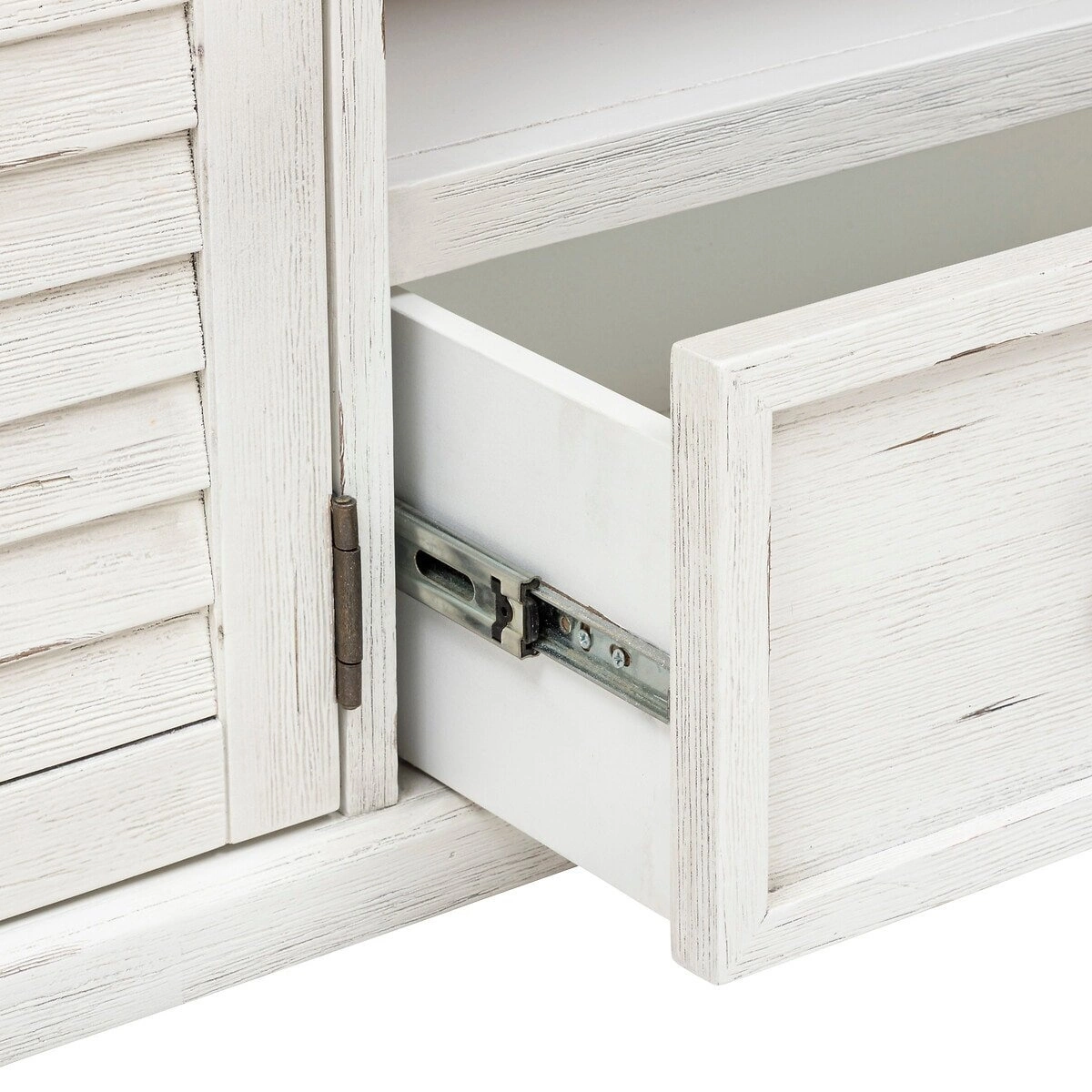 Szafka RTV Olbia biała drewniana 140 cm marki Atmosphera to uniwersalny mebel, który łączy ponadczasową elegancję z praktycznym podejściem do organizacji przestrzeni. Wykonana z połączenia drewna akacjowego i wysokiej jakości płyt meblowych, oferuje dużą powierzchnię blatu, pojemne półki i praktyczną szufladę, idealną do przechowywania akcesoriów RTV oraz dekoracji. Matowe, białe wykończenie podkreśla nowoczesny, lekko rustykalny charakter szafki, a blat z naturalnego drewna akacjowego wprowadza do wnętrza przytulność i ciepło.Poznaj bliżej szafkę RTV Olbia – idealne połączenie designu i funkcjonalności