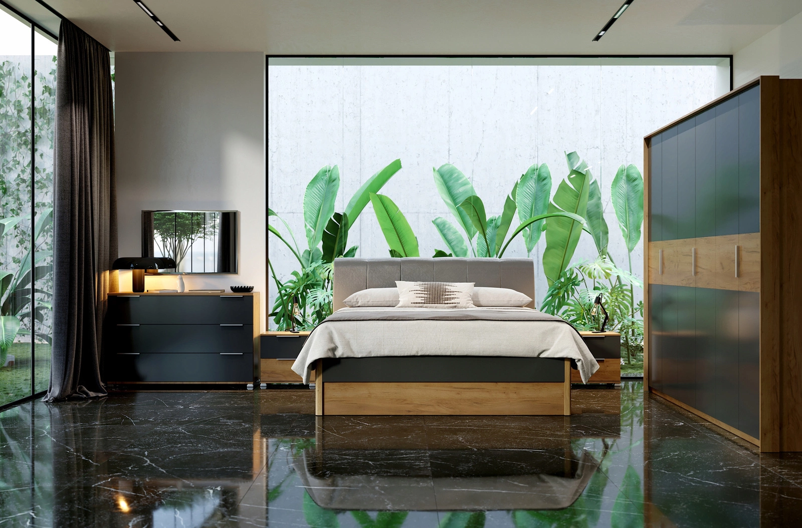 - Nowoczesne połączenie koloru dąb craft i szarości – wyjątkowy styl do sypialni i garderoby