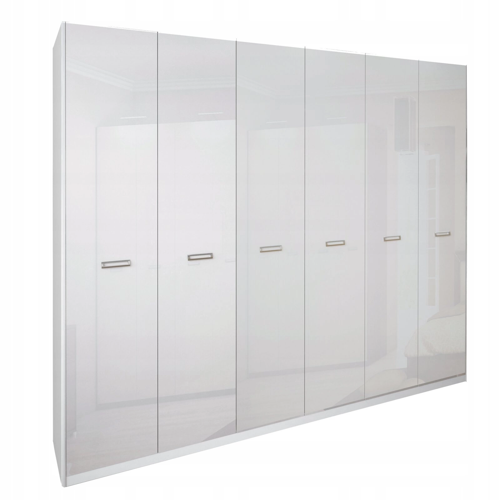 Szafa Bella 6-drzwiowa to nowoczesny mebel do sypialni, wykonany w całości w eleganckim białym połysku. Oferuje aż 225 cm wysokości, 272 cm szerokości i 55 cm głębokości, co zapewnia bardzo dużą pojemność. Wyposażona w praktyczne półki oraz drążek na ubrania, pozwala na wygodne przechowywanie zarówno odzieży wiszącej, jak i złożonej.