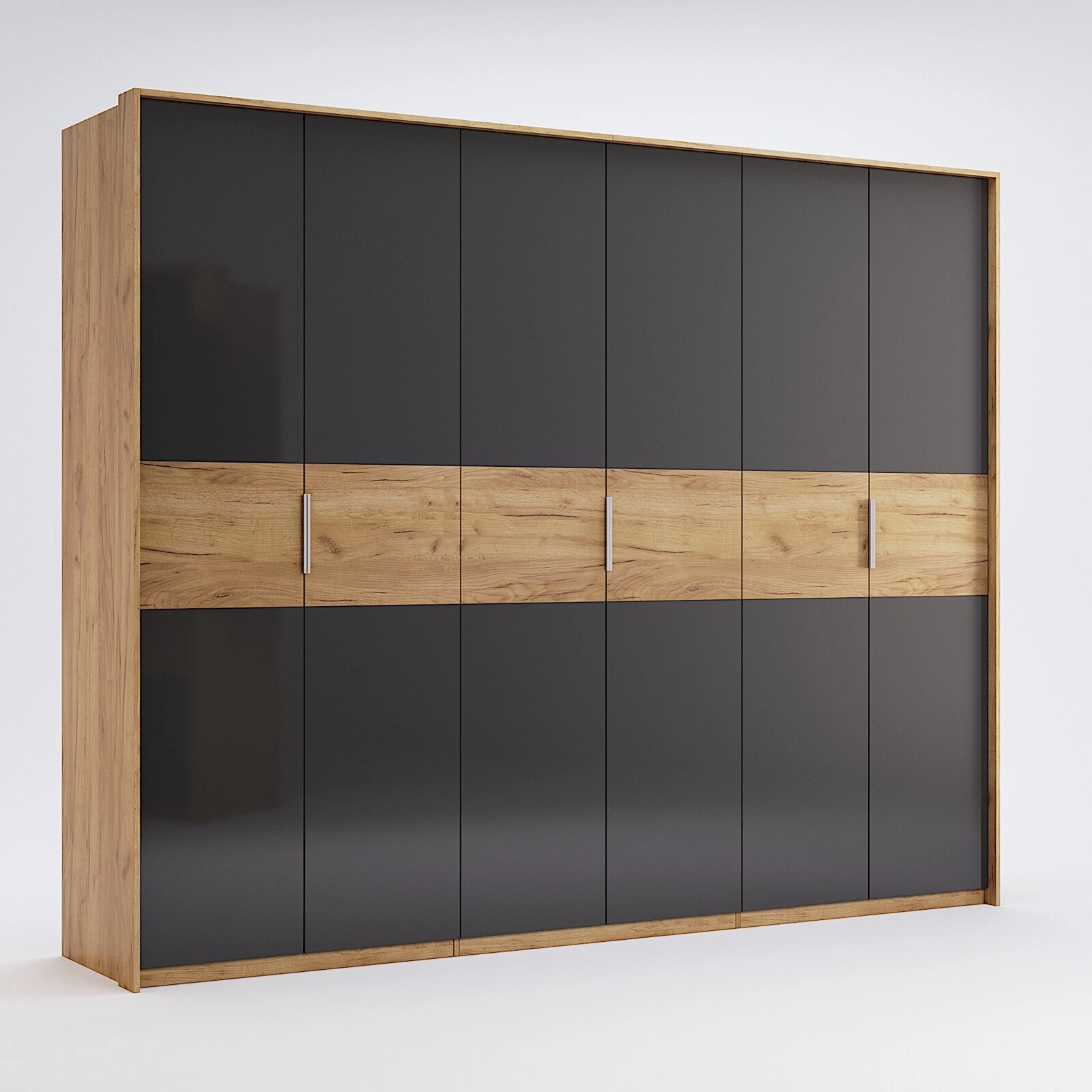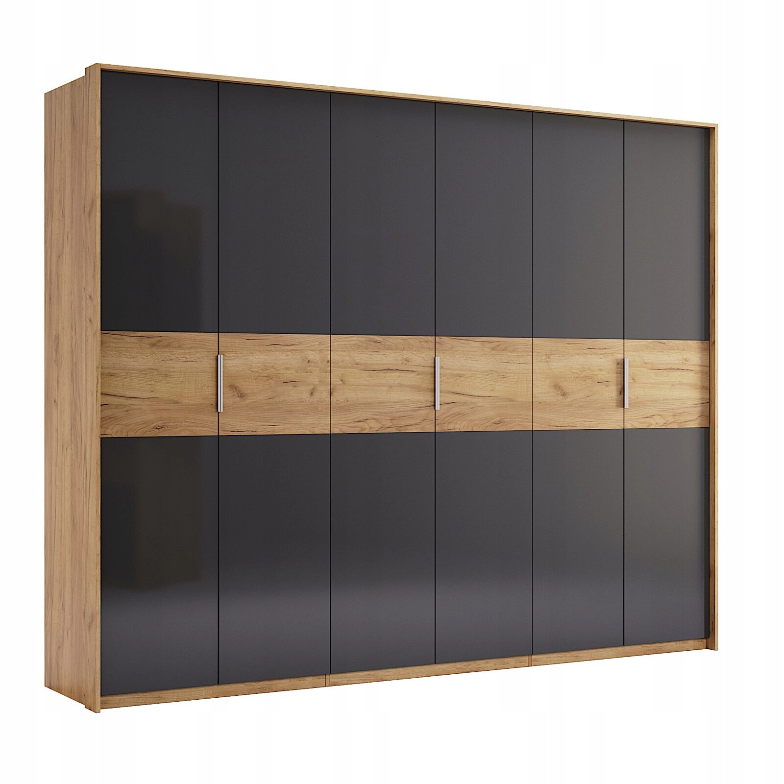 Szafa Matle 6-drzwiowa to pojemny, nowoczesny mebel o imponujących wymiarach 213×274×58 cm, zaprojektowany z myślą o funkcjonalności i estetyce. Łączy w sobie ciepły odcień dębu craft z eleganckim szarym kolorem, wykończonym w półmacie. Dzięki sześciu drzwiom i praktycznym półkom zapewnia wygodne przechowywanie ubrań i akcesoriów, idealnie sprawdzając się w sypialni, garderobie lub pokoju młodzieżowym.
